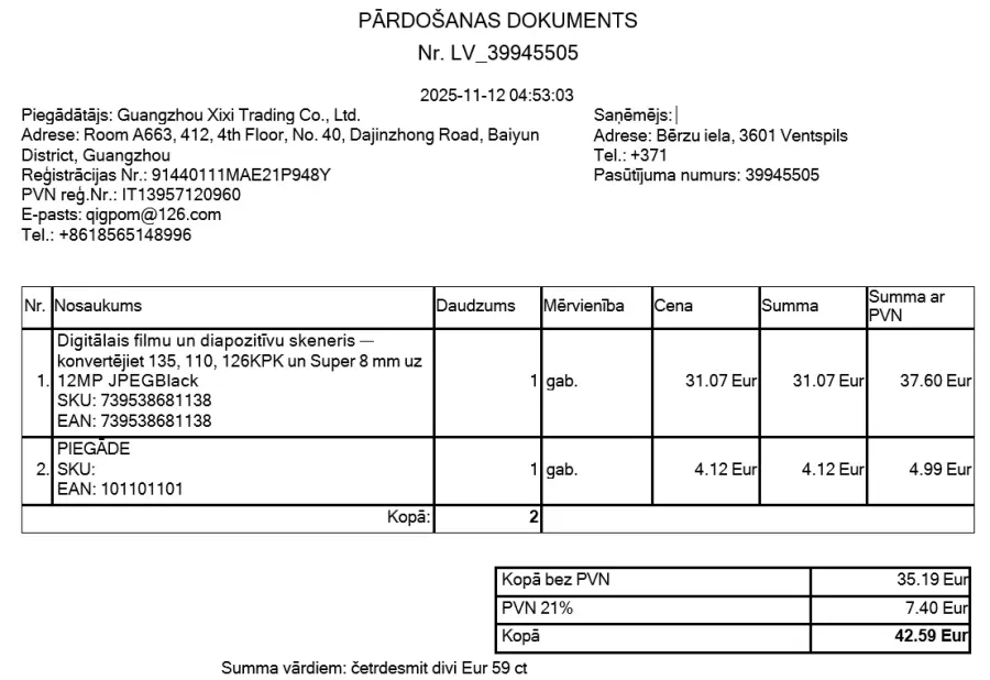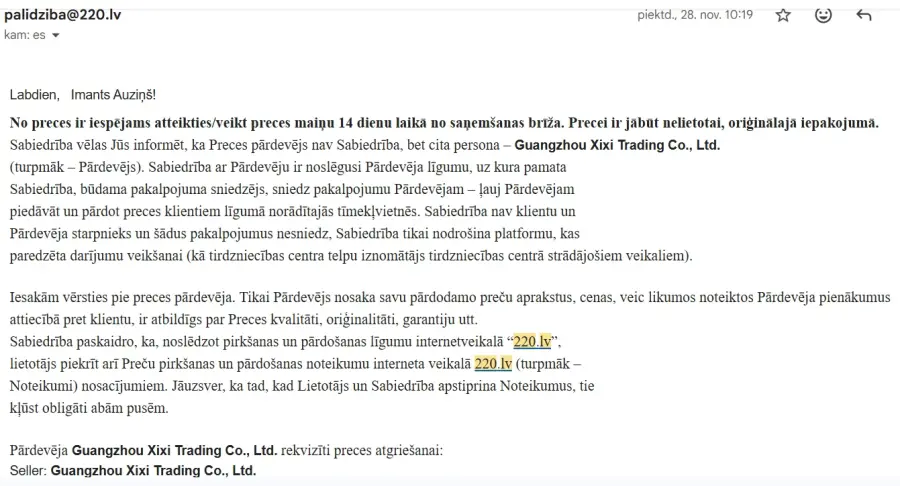 Iegādājos 220.lv piedāvāto filmu skeneri, kurš izrādījās zemas kvalitātes, par ko uzrakstīju 220.lv atbalsta dienestam. Saņēmu atbildi, ka 220.lv par preci neatbild, jo pārdevējs cits, kaut gan preci piedāvāja 220.lv. Sazinoties ar, pārdevēju, SIA PIGU, saņēmu atbildi, ka skeneris ir kvalitatīvs, bet varu viņu nosūtīt uz pievienoto adresi (306. istaba, C ēka, AoTuAo radošais parks, Luopu iela, Panyu rajons, Guandžou pilsēta, Guandunas province, Ķīna) par savu naudu, pretēji norādītajam, ka preci paņems kurjers.