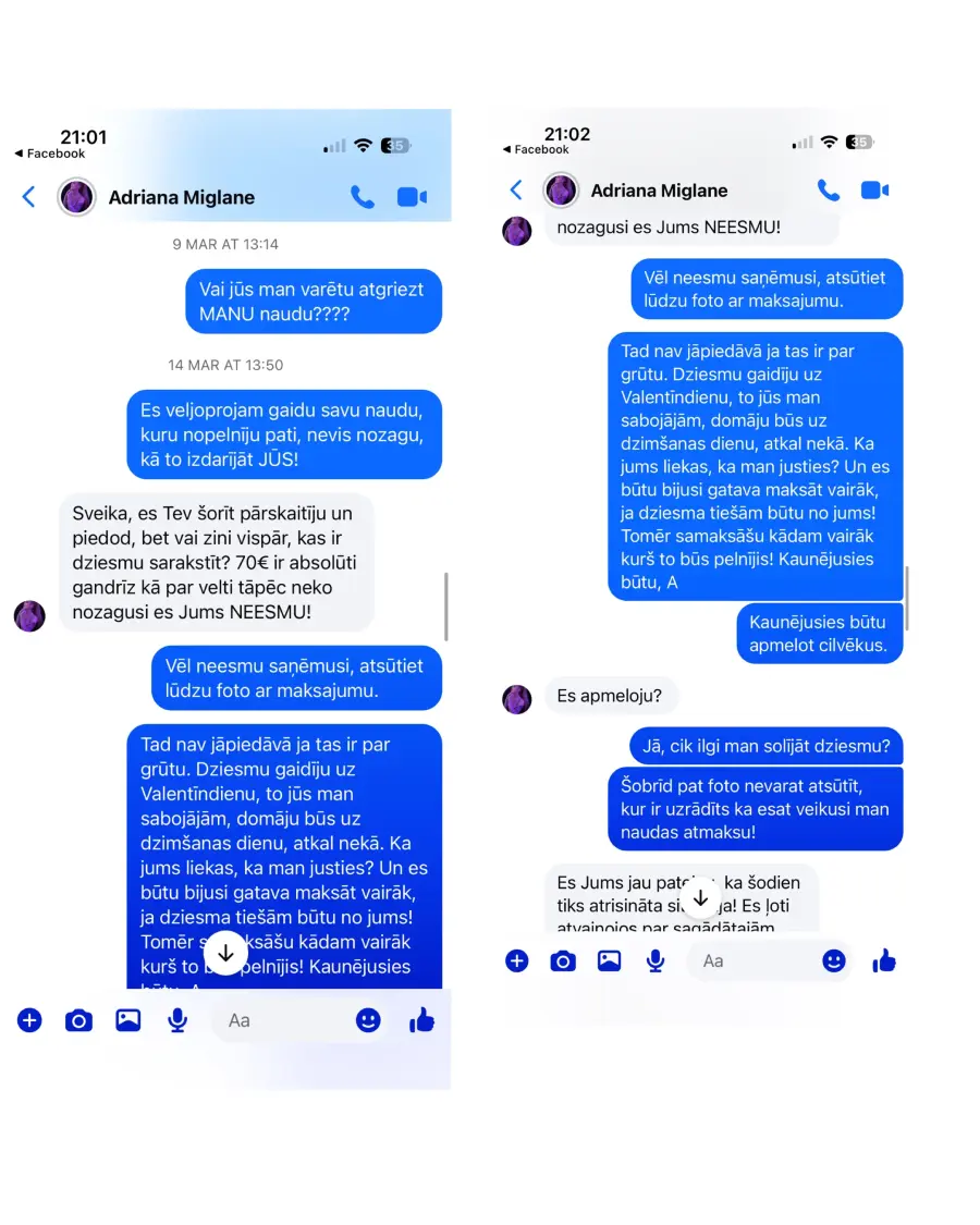 Diemžēl tiku maldināta mēneša garumā no Adrianas Miglānes puses, viss info redzams pievienotajos attēlos.