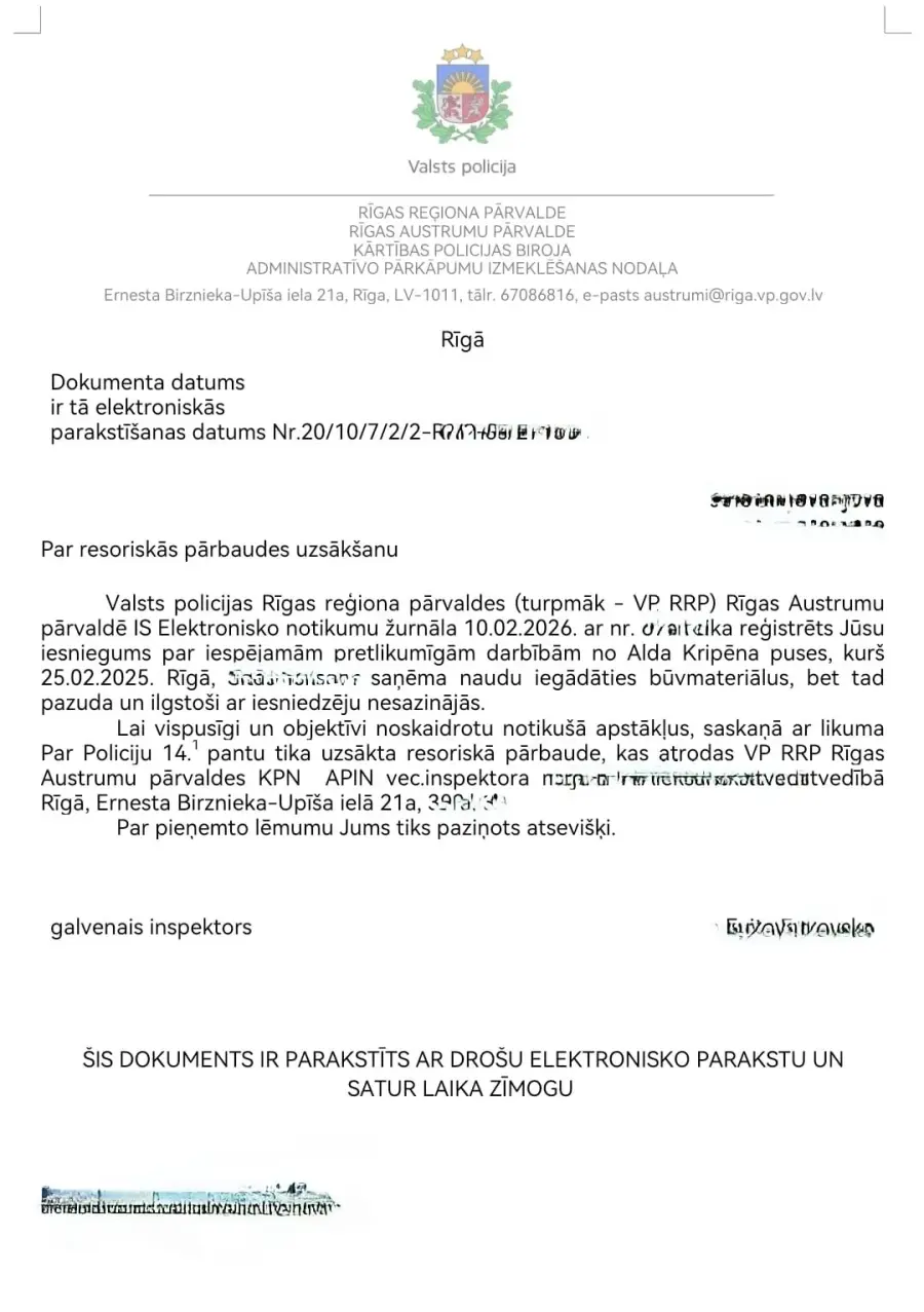 2025. Gada 25. Februārī saņema 2000 (divus tūkstošus) eiro ar mērķi iegādāties būvmateriālus mājokļa remontam. Aldis kripēns apņēmās iegādāties būvmateriālus, taču pēc naudas saņemšanas pazuda un ilgstoši ar mani nesazinājās. Līdz šim brīdim būvmateriāli nav iegādāti, nav saņemti čeki vai kādi citi dokumenti par būvmateriālu iegādi, kas tika solīti, un naudas summa nav atgriezta. Informācija nodota policijai.