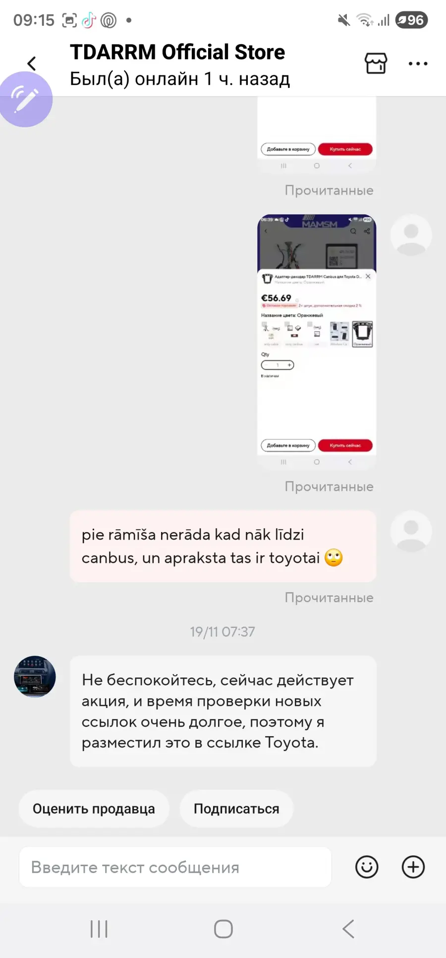 Šis ir pēdējais piliens, sameklēju preci, pārdevējs solās izsūtīt vadu un canbus bet jāņem ar rāmi, pārskaitīju 56e un atnāk tik rāmītis kas man neder un kuru man nevajadzēja. Atvēru strīdu, pārdevējs piekrita atsūtīt iztrūkstošo, kā strīdu aizvēru tā mani bloķēja, aliexpress atbalsts man nepalīdz, viss redzams bildēs