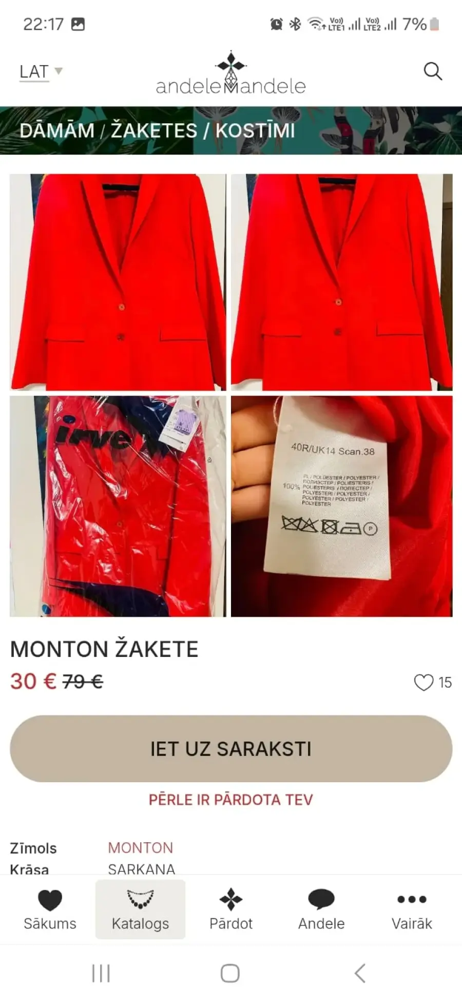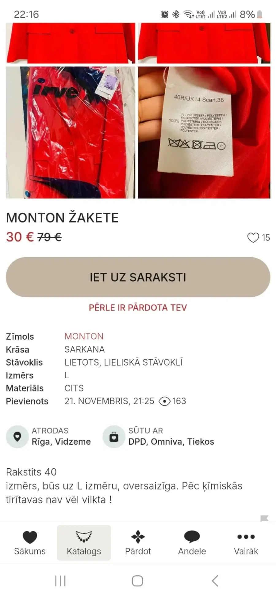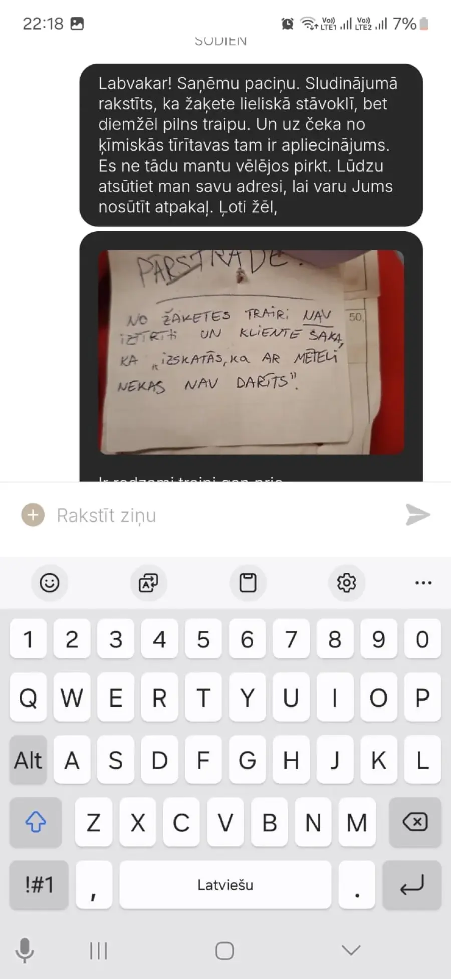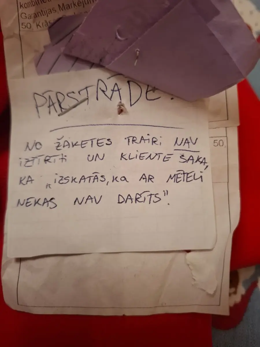 Krāpniece trine_jakobine- L. Jurševiča! Pasūtīju žaķeti ideālā stāvkolī pēc ķīmiskās tīrītavas pa 30 eiro, saņēmu šo! Pārdevēja nepamanīja, ka atstāja piestiprinātu atsauksmi un slēdzienu no ķīmiskās tīrītvas par to, ka traipus nevar iztīrīt! Šādā stāvoklī APZINĀTI ielika pārdot sabojātu žaķeti ar defektiem un plankumiem pa 30 eiro! Bildēs žaķeta izskatījās ideāli! Nopirku! Dzīvē vēl ir savēlumi, kamera nenodod visus defektus! Uzrakstīju, palūdzu atgriezt naudu un nosūtīt atpakaļ žaketi! Sieviete atteica un nobloķēja saraksti! Nekādas atbildības, negodīga ! Nopelnīja 30 eiro ar mānīšanos! Ļoti sarūgtina šāda pieredze! Neticiet! Apmānīs un nobloķēs! Naudu neatrgrieza! Mēģināju atrisināt šo nepatīkamo situāciju un brīdināju, ka publicēšu saraksti. Diemžēl satiekas arī šādi negodīgi cilvēki!