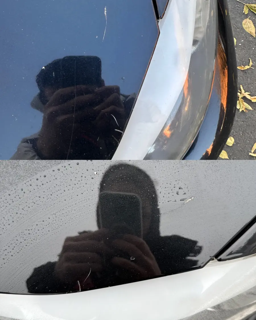 Пойдём по порядку. Первый случай по KASKO: Смотрю на капот, а царапины так и остались, мастера решили сэкономить своё время и ресурсы, так как мы выбрали полировку всего кузова и надеялись, что мы не заметим и проблема решится полировкой. Фара должна была меняться (окей, стекло в ней). Но , что мы видим, глубокие царапины так и остались.