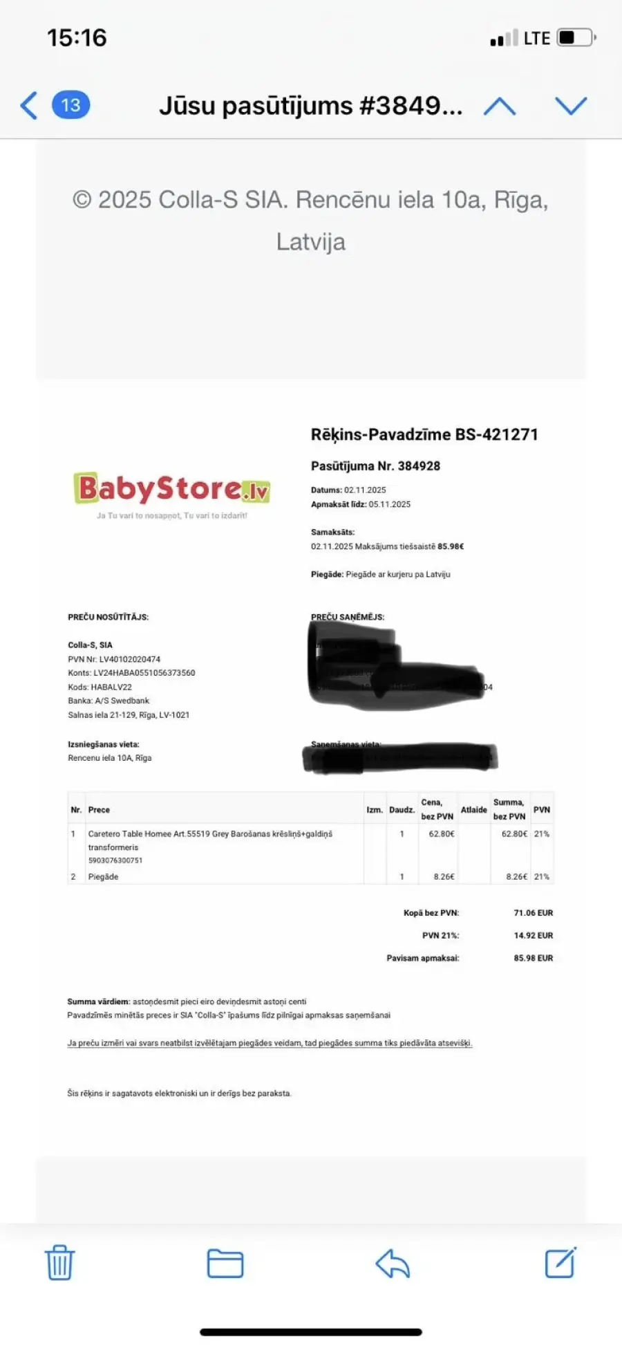 02.11.2025 pasūtījām bērnu barošanas krēsliņu + galdiņš, ko mēs tieši gribējām vairs ne bija mums pateica līdz 19.12.2025 būs atgriezta nauda, tomēr nauda nebija atgriezta, mēs piezvanījām, mums meitene piedāvāja kaut ko līdzīgu mums tas derēja, mēs vēl uzprasījās vai šis ir uz vietas, mums atbildēja šis ir pieejams, pateica 7dienu laika būs, bet šodien ir 15.01.2026 nav ne galdiņa ne naudas, klausili man nometa, uz manējo numuru necel klausili, piezvanu no cita numura tad atbild.