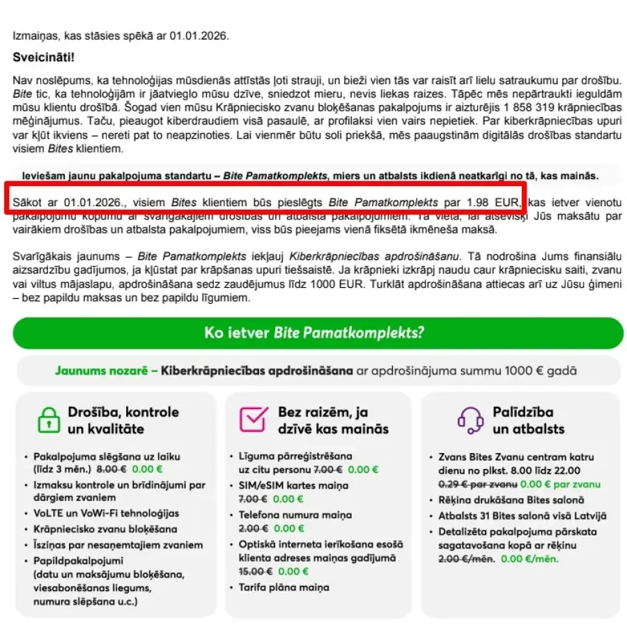 Faktiski, Bites klientiem, no 2026 gada, par papildus 1.98EUR mēnesī tiek uzspiests papildus pakalpojums, kurš lielākajai daļai noteikti nav nepieciešams.