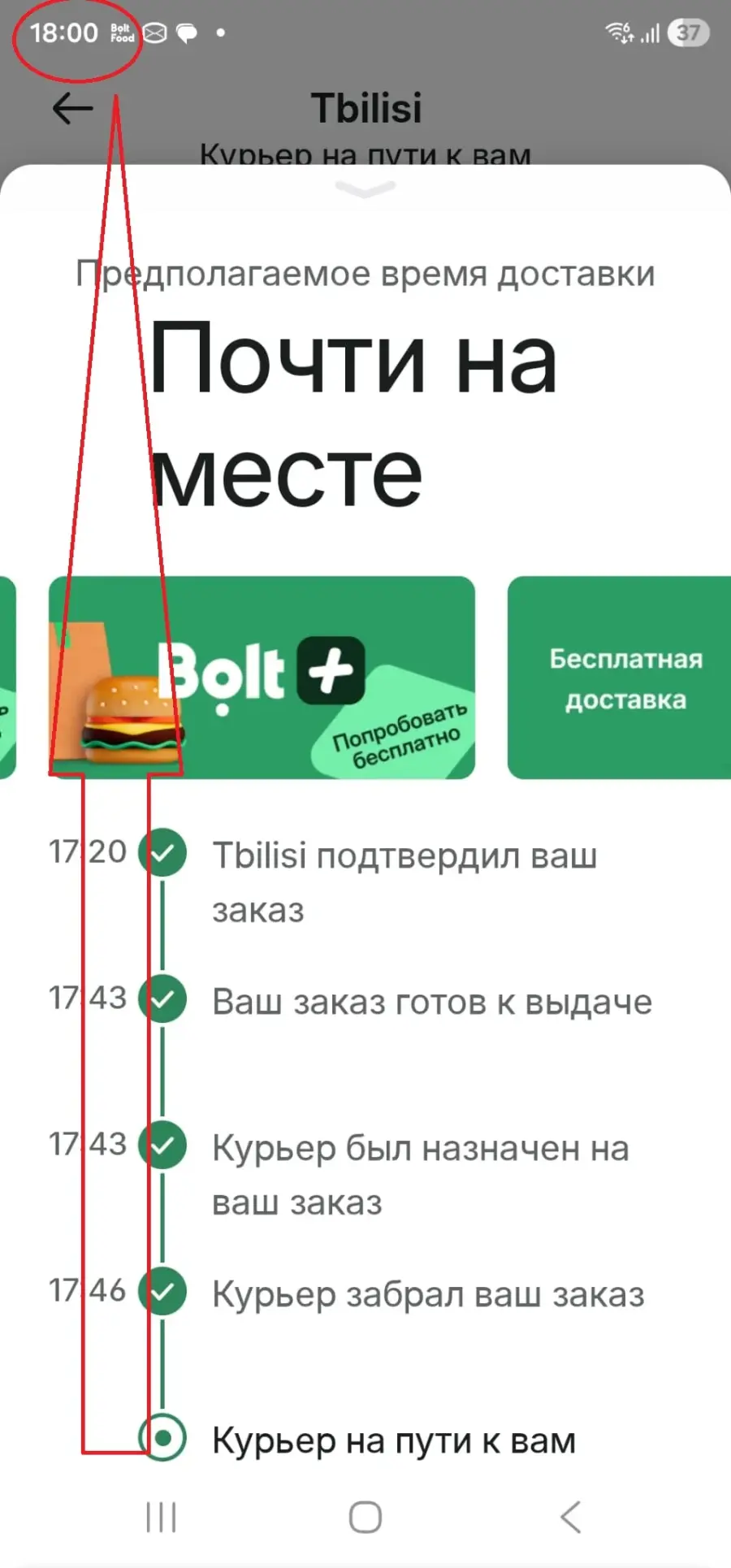 Tomēr Bolt Food loģistika nolēma citādi. Kurjers paņēma pasūtījumu 17:46, bet tā vietā, lai 2–3 minūšu laikā atbrauktu līdz blakus mājai, viņš aizbrauca pretējā virzienā pie cita klienta. Rezultātā mans pasūtījums tika vadāts pa pilsētu vairāk nekā 15 minūtes. Visa jēga sūtīt ēdienu no kaimiņu restorāna tika pilnībā iznīcināta — ēdiens atbrauca atdzisis.