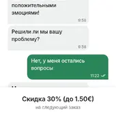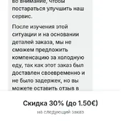 Beigās, kad viņi tomēr atzina, ka pieredze bija «slikta», man tērzēšanā atsūtīja sirsniņas un piedāvāja pazemojošu kompensāciju — 30% atlaidi (ar limitu līdz 1.50€) nākamajam pasūtījumam.
