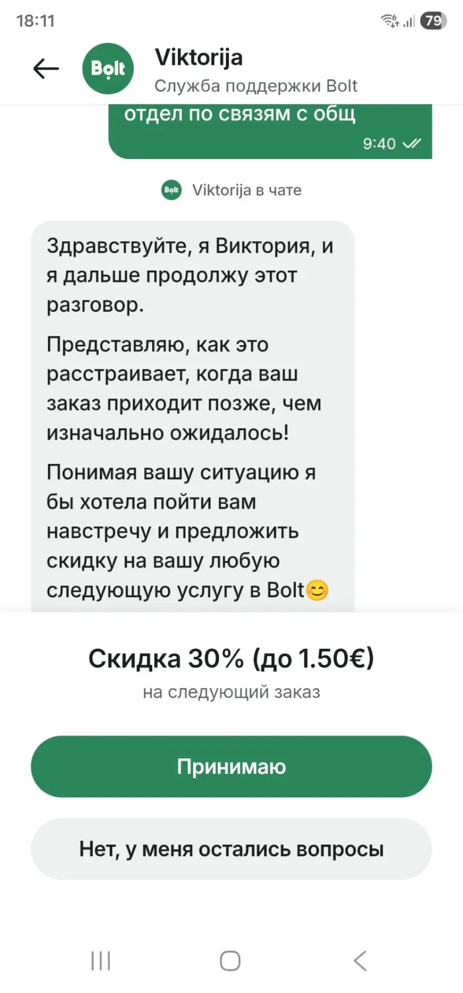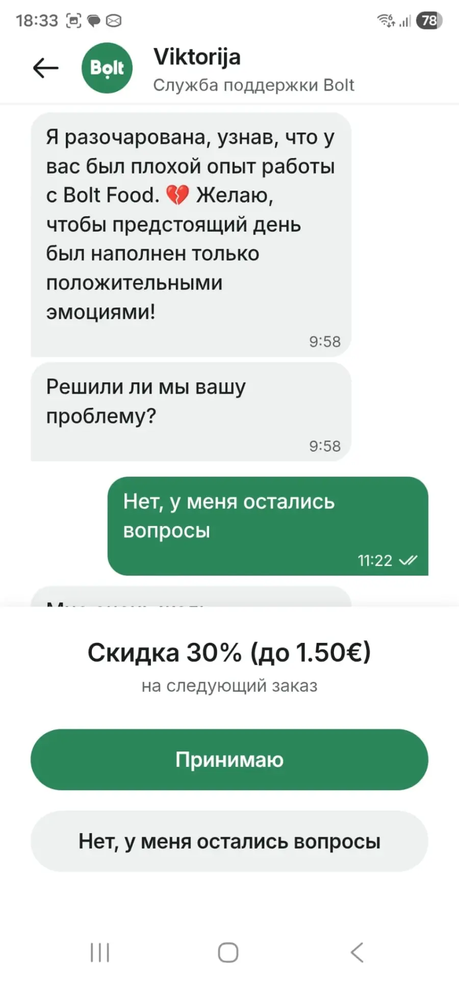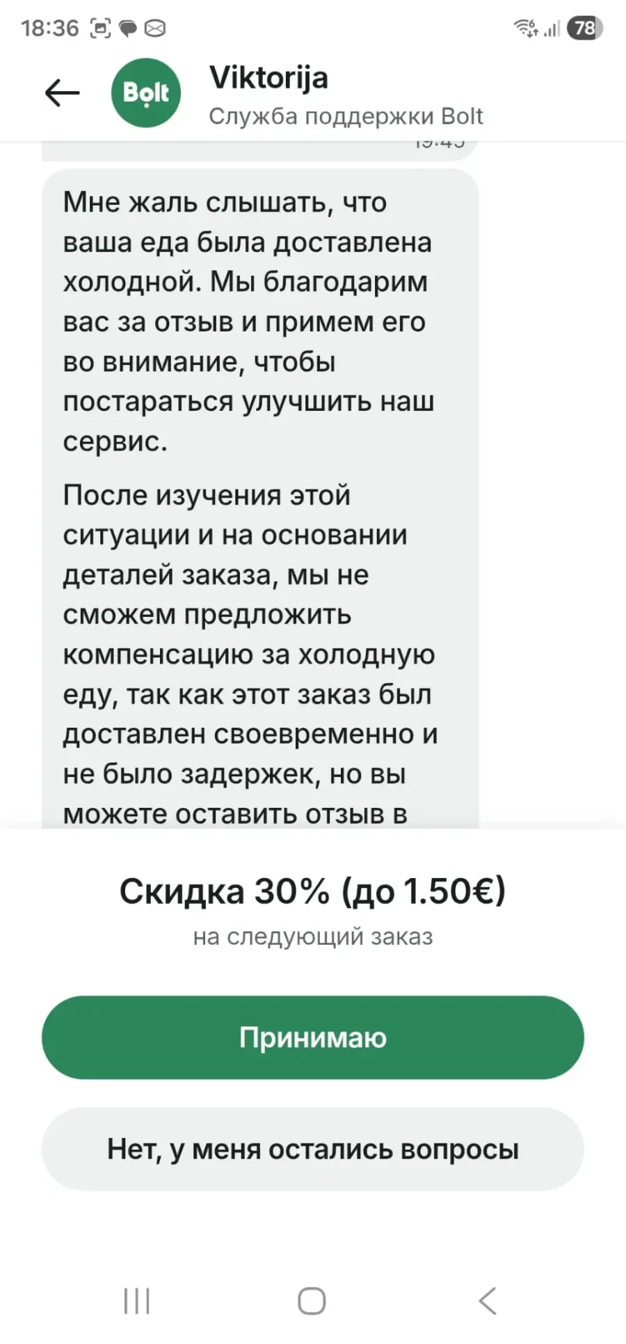 Kas par bezkaunību un liekulību no Bolt puses! Sūtīt čatā sirsniņas un vēlēt "pozitīvas emocijas", kamēr klients ir saņēmis aukstu ēdienu uzņēmuma kļūdas dēļ, ir vienkārši ņirgāšanās. Piedāvāt 1.50€ atlaidi pēc tādas loģistikas kļūdas ir pazemojoši — tas parāda, cik zemu viņi vērtē savus klientus.