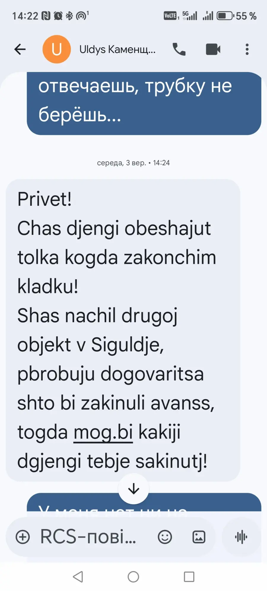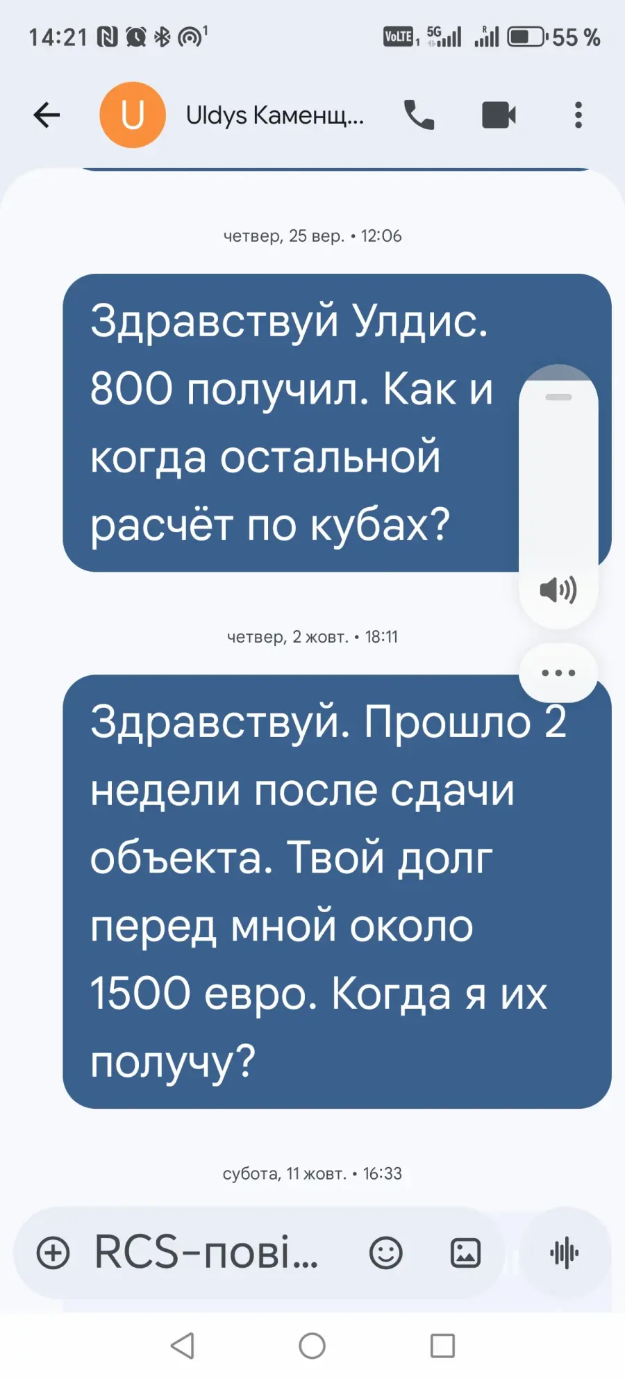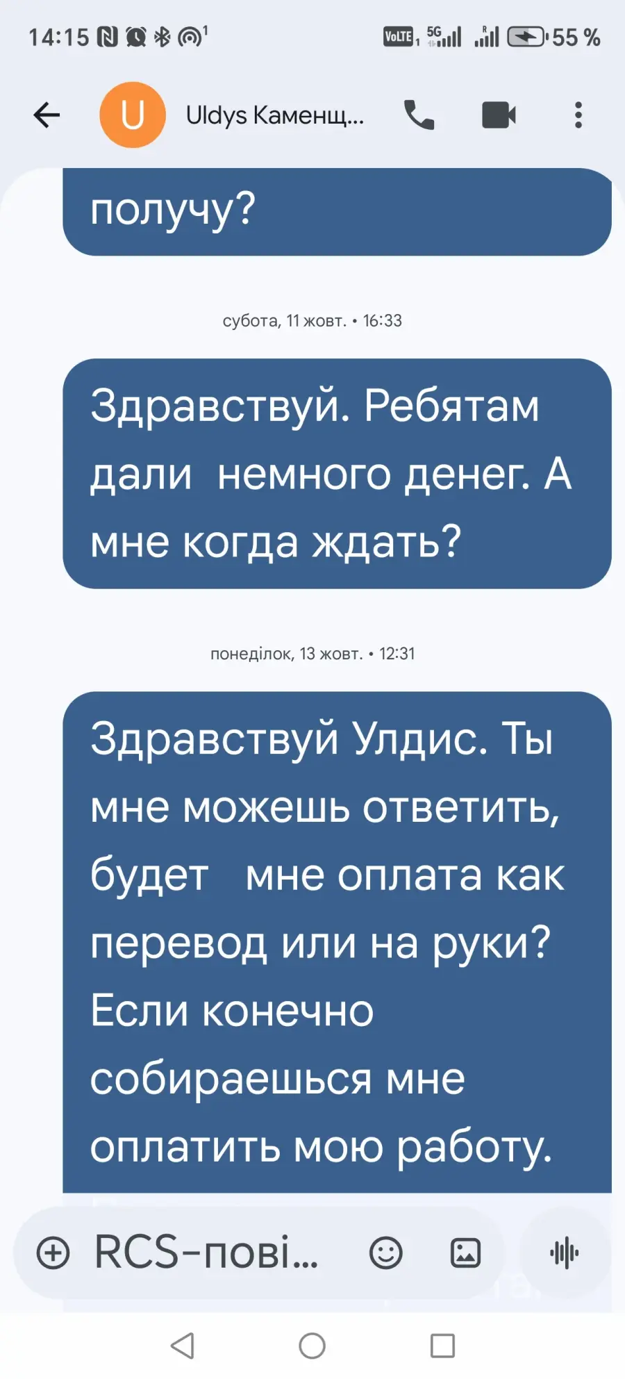 Я, Виталий Новиков, подписал договор и принял устные обязательства от Uldis Reinfelds , по строительству дата центра в Саласпилсе, а именно монтаж блоков Fibo 250,300. Работу закончили 17.09.2025. Август и сентябрь не получали денег, так как Uldis Reinfelds говорил, что компания заказчик - Citrus , требует выполнить всю работу и тогда оплатит. 18.09.2025 я был уволен, часть денег получил. Дальше Uldis Reinfelds перестал выходить на связь. Я знаю, что некоторым строителям в Tukums привозили деньги наличными. Долг передо мной на 18.09.2025 и до сих пор 1500 евро! И это без всяких доплат