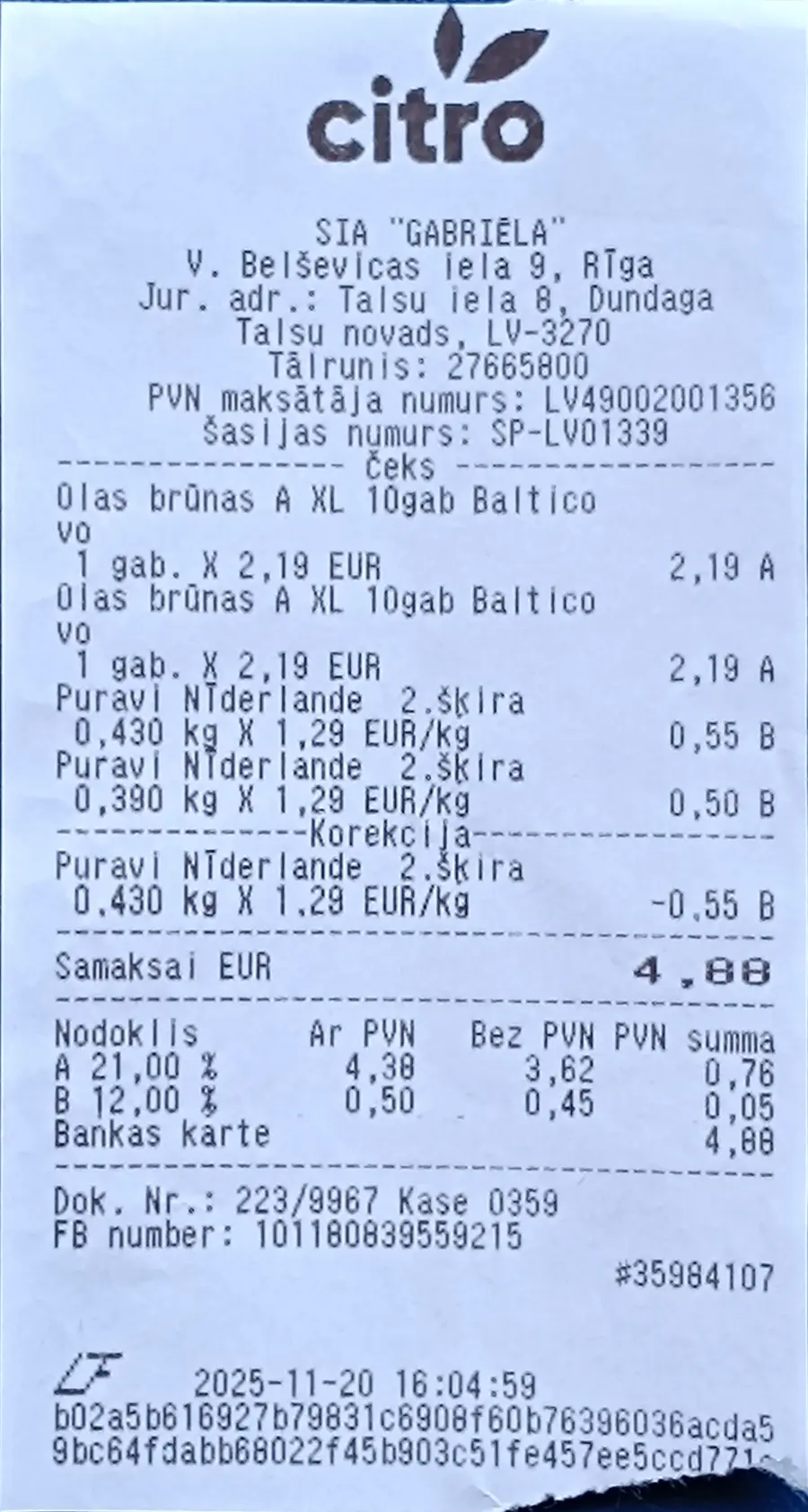 20 ноября 2025 года около 16 часов мы вошли в магазин "CITRO" по адресу Vizmas Belševicas iela 9, Rīga, (SIA “Gabriēla”, Talsu iela 8, Dundaga, Talsu novads, LV-3270) за продуктами. На кассе мы объяснили продавщице, что этикетки с ценой наклеивать непосредственно на стебель лука-порея нельзя, поскольку клей этикетки не предназначен для пищевых продуктов. Продавщице понадобилось срочно сообщить об этом старшей продавщице. Когда та явилась, мы объяснили также это и ей. Тогда, чтобы показать съедобность этикетки, схватила стебель лука и сожрала этикетку. Да, именно сожрала: широко открыла рот, засунула в рот стебель порея и отгрызла этикетку вместе с луком. После этого начала хамить, закончив словами: "Ходят тут, работать мешают."