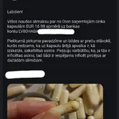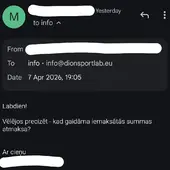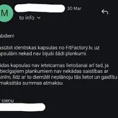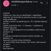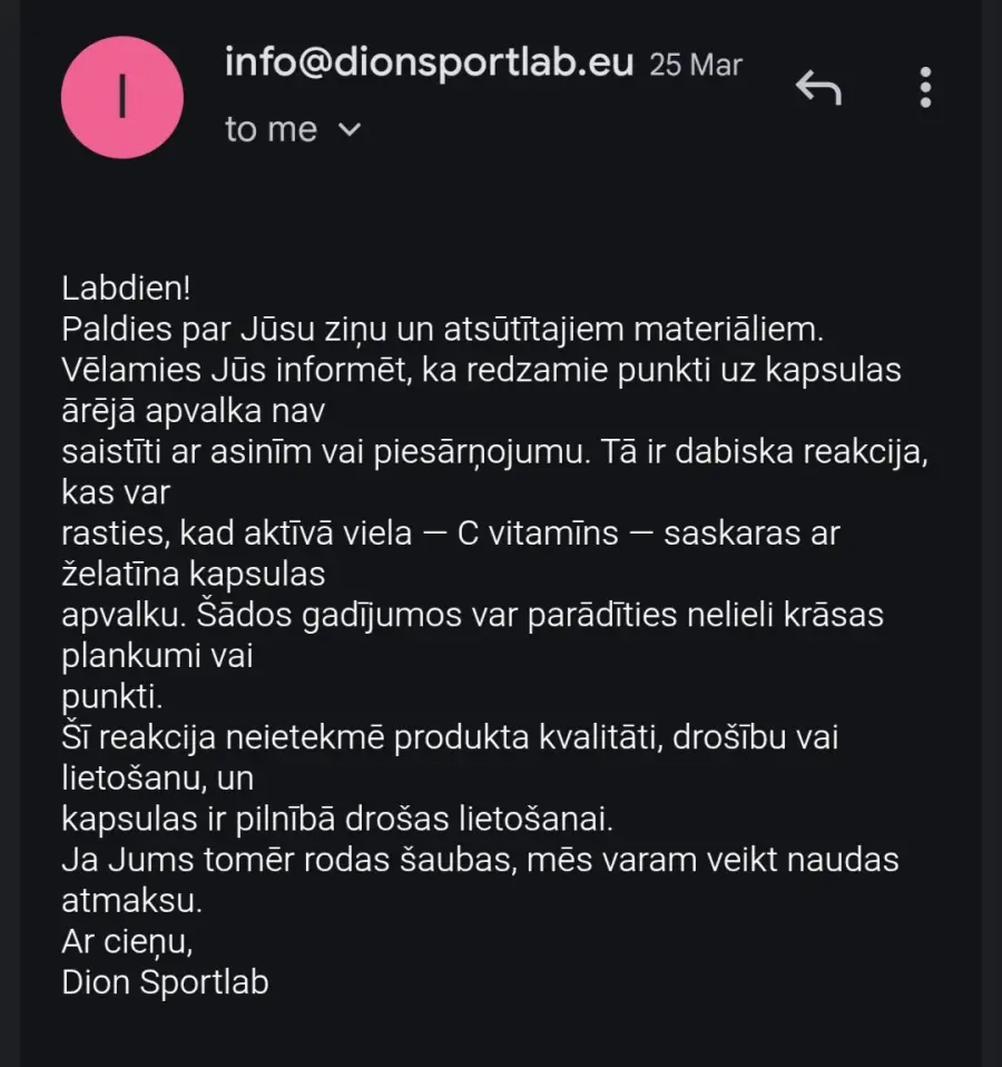15.03.2026. www.dion.lv iegādājos ZINC 250 Sport 60 kapsulas (2 iepakojumus, pasūtījuma numurs 1987424). Saņemot preci, konstatēts, ka abos iepakojumos ir kapsulas ar sarkanbrūniem pleķiem, kuras līdz ar to nav ieteicamas lietošanai. Kā arī, pasūtot identisku preci no www.fitfactory.lv, šādas problēmas nekad nav bijušas. 24.03.2026. tika pieprasīta iemaksātās summas atmaksa, uz ko Dion reaģēja ar e-pasta ziņu, ka “var veikt naudas atmaksu”, it kā neizteicos pietiekami skaidri par to, ka vēlos iemaksātās summas atmaksu un viņu atbildes e-pasta ziņa automātiski atceļ manis rakstīto. 30.03.2026. atmaksa joprojām netika saņemta, kompānijai nosūtīta papildus e-pasta ziņa ar atkārtotu lūgumu atgriezt iemaksāto summu, uz ko atbilde nav saņemta vispār. 07.04.2026. atmaksa joprojām netika saņemta, nosūtīta atkārtota e-pasta ziņa, uz kuru arīdzan nav saņemta atbilde. 08.04.2026. atmaksa joprojām netika saņemta, nosūtīta e-pasta ziņa ar atgādinājumu par to, ka atmaksa joprojām nav saņemta – uz ko ARĪDZAN atbilde NAV saņemta.
