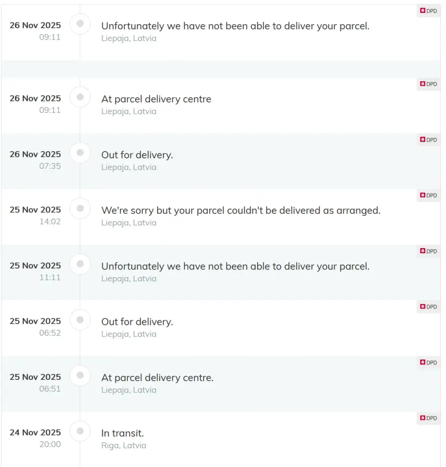 Sliktākais paku piegādes pakalpojuma sniedzējs Latvijā. To varu apgalvot pēc sava sūtījuma problemātiskās piegādes no DPD puses. DPD atsūta sms par piegādes laiku, zinu, ka nebūšu mājas. Klikoju uz sms norādītā linka adresi ar iespēju mainīt piegādes laiku, bet tas nav iespējams. Var mainīt piegādes datumu uz citu dienu, bet norādīt kaut dienas pirmo vai otro pusi piegādei nav iespējams! Izmainu datumu uz nākamo dienu. Nākamā dienā saņemu sms ar laiku, kas atkal neatbilst manam darba grafikam. Sazvanu DPD palīdzības dienestu un operators apstiprina, ka laiku iespējams mainīt nav, kurjeru iespējams sazvanīt nav. Turklāt es nevaru atbildēt uz kurjera zvanu laikā, kad viņuprāt viņiem varētu būt izdevīgi piegādāt paku. Tā nu paku pāradresēsim uz nākamo dienu, līdz 'sistēma', kā izteicās DPD operators, ieplānos laiku, kas man ir pieņemams. Un stāsts šeit nav par ārpus darba laika piegādi, bet par pakas piegādi darba dienas ietvaros. Būtu tikai normāli, ja klientam būtu iespējams izvēlēties vismas dienas pirmo vai otro pusi pakas piegādei. Un ja to nevar nodrošināt, tad 'iespējams', pirms likvidēt paku bodes, par to padomāt. P.s. Paku nav iespējams ievietot pakomātā izmēru dēļ. Sūtījuma nr, 01505513308227