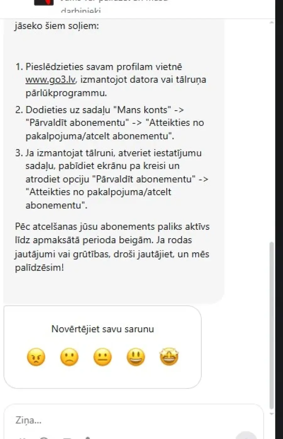 pie GO3 tā vienkārši nevar atcelt abonementu - ne caur sazvanu, ne caur savu profilu, ne caur e-pastu. Caur epastu, gan tikai piedāvāja pārslēgt līgumu, to gan viņi neaizmirst, nevis atbildētu, ka iesniegums jāraksta, ne pušplēsta vārda par to. Interneta gO3 profilā caur čatu ierakstīju, ka vēlos atcelt abonementu un man atnāca šāda ziņa :