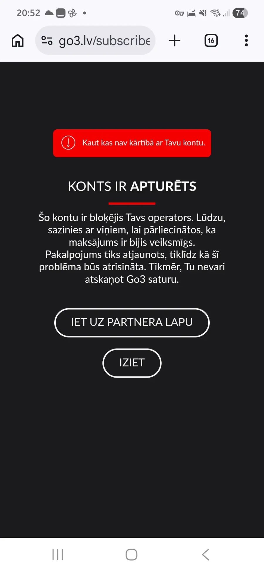 Trešajā mēnesī (tagad) vienkārši tiek atslēgts. Ekrāna paziņojums, ka iespējams nav veikta apmaksa! Nosūtu šiem maksājuma kopiju. Atbild nākamajā dienā 15.45 ar prasību norādīt personas koda otru pusi. Ko arī izdaru un nu jau ir pagājusi jau otra diennakts un nav nekādas atbildes.