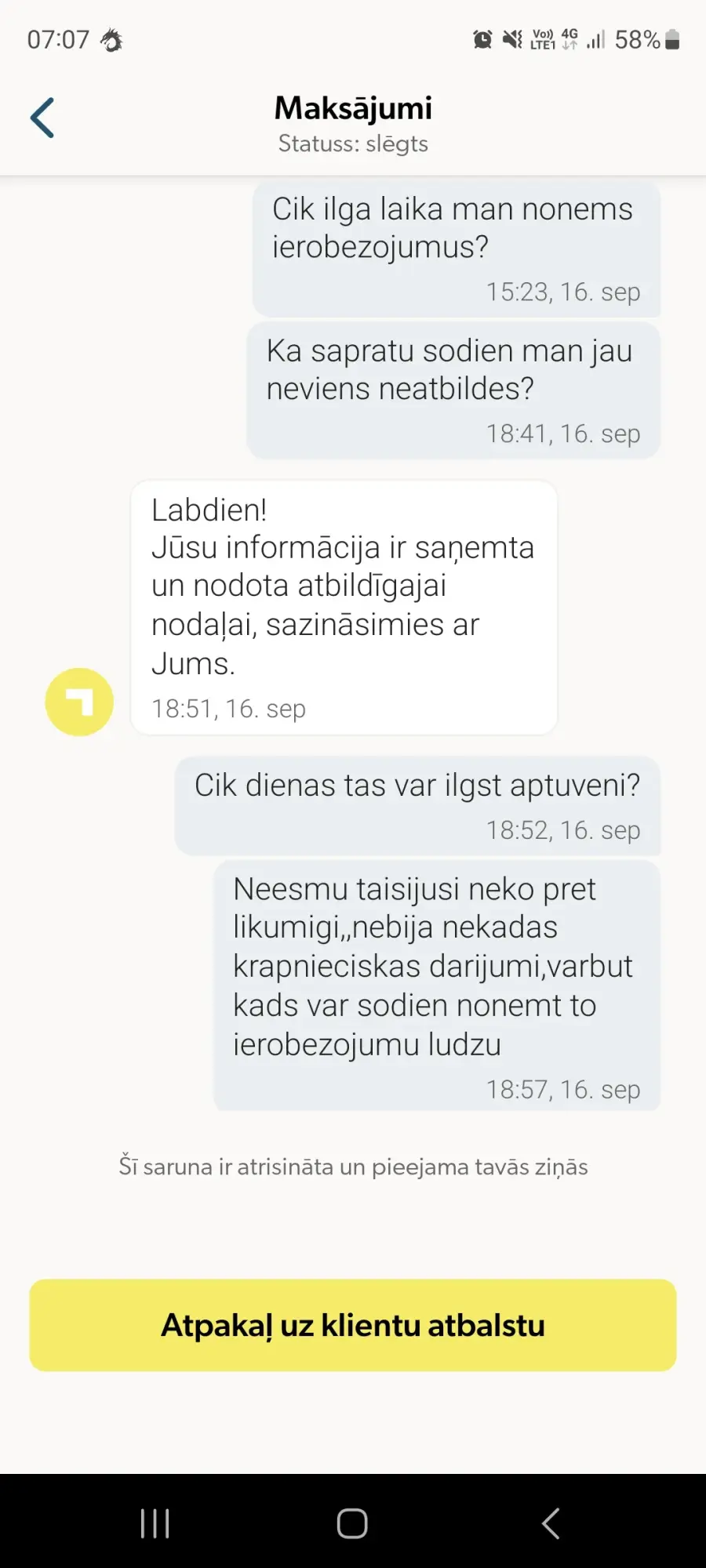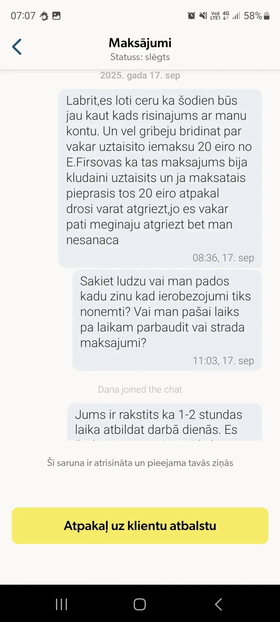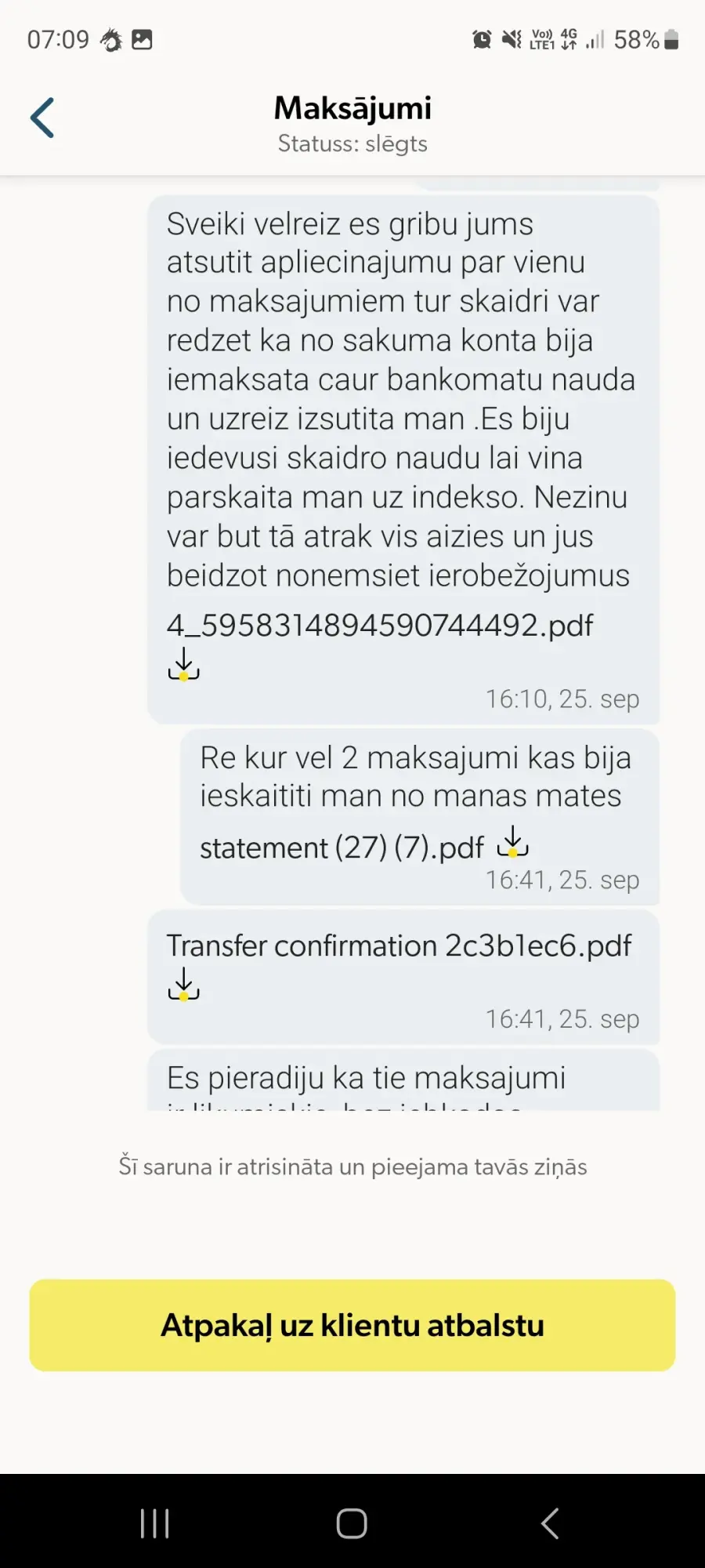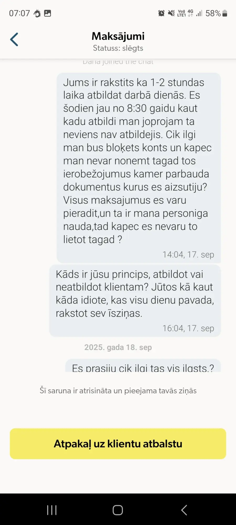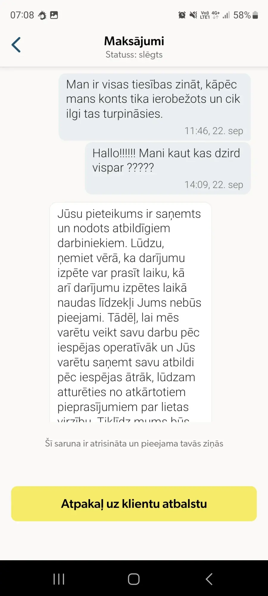 Tā situācija notika 15 septembrī. Es no rīta aizgāju uz poliklīniku, un kad es gribēju samaksāt par pakalpojumiem mans maksajums no indexo kartes tika noraidīts. Es iegāju aplikācijā, paskatījos ka nauda ir atkal mēģināju samaksāt, atkal atcēla. Tad es pamēģināju aizsūtīt naudu caur kontu savai mammai, bet nevarēju jo tika noraidīts. Tad es saku rakstīt support kas ir par problēmu? Kāpēc mani maksājumi ir atcelti un kas vispār notiek. To vēstuli es aizsūtīju viņiem 10 no rīta un tikai 15: 00 man atbildēja. Bet bija nevis atbilde uz manu jautājumu, bet saraksts ar jautājumiem. Protams es uz visiem jautājumiem atbildēju, plus pieliku klāt dokumentus kurus viņi gribēja, uz ko man uzrakstīja ka dokumenti aizsūtīti uz pārbaudi gaidiet. Pẽc