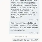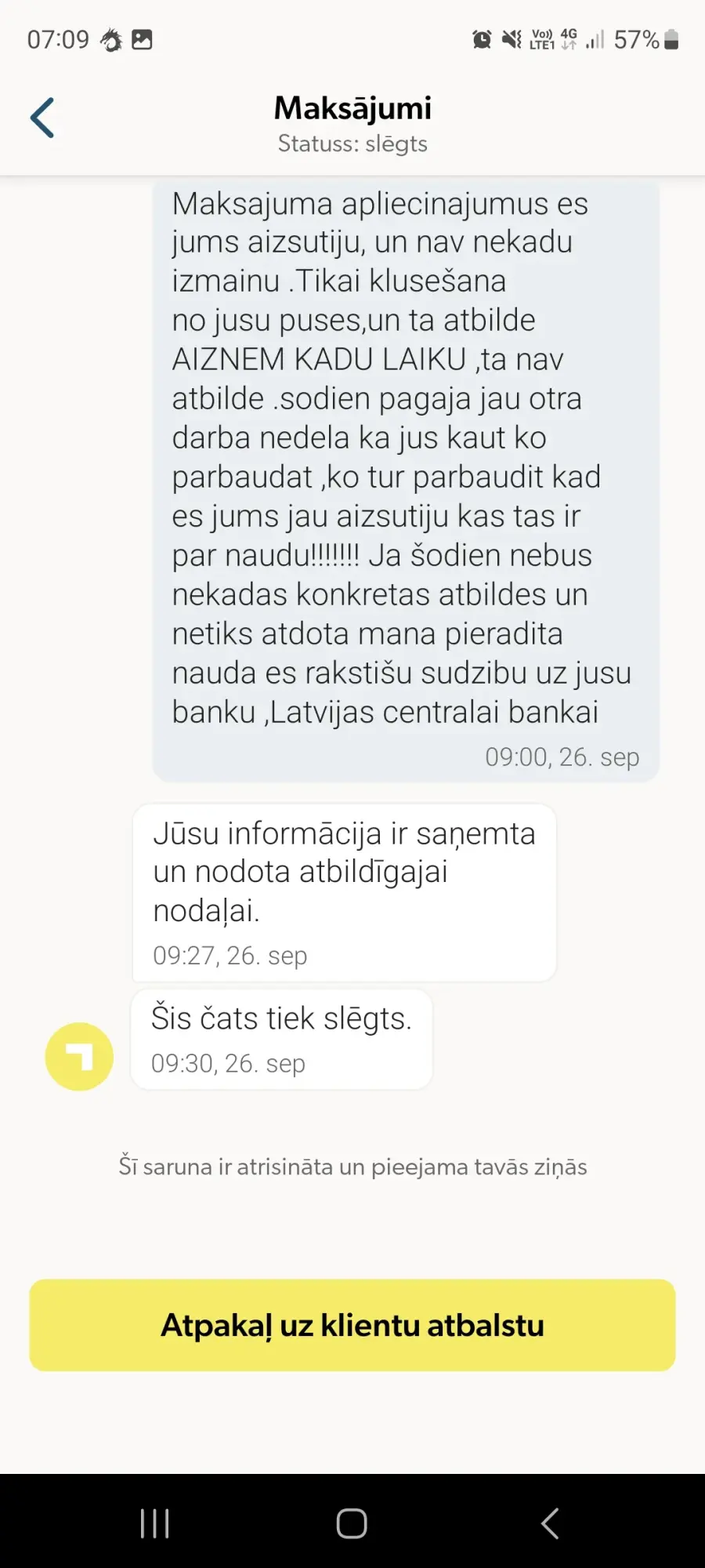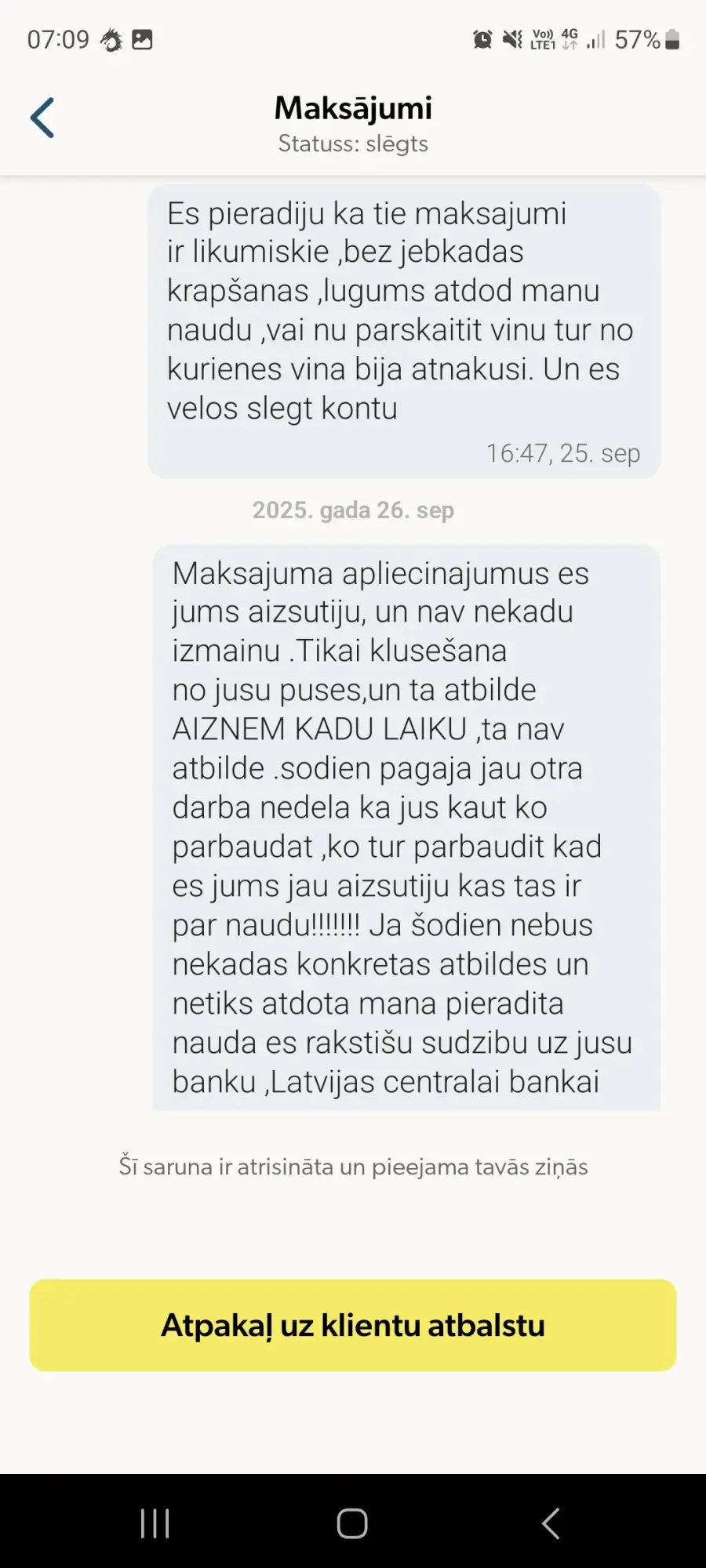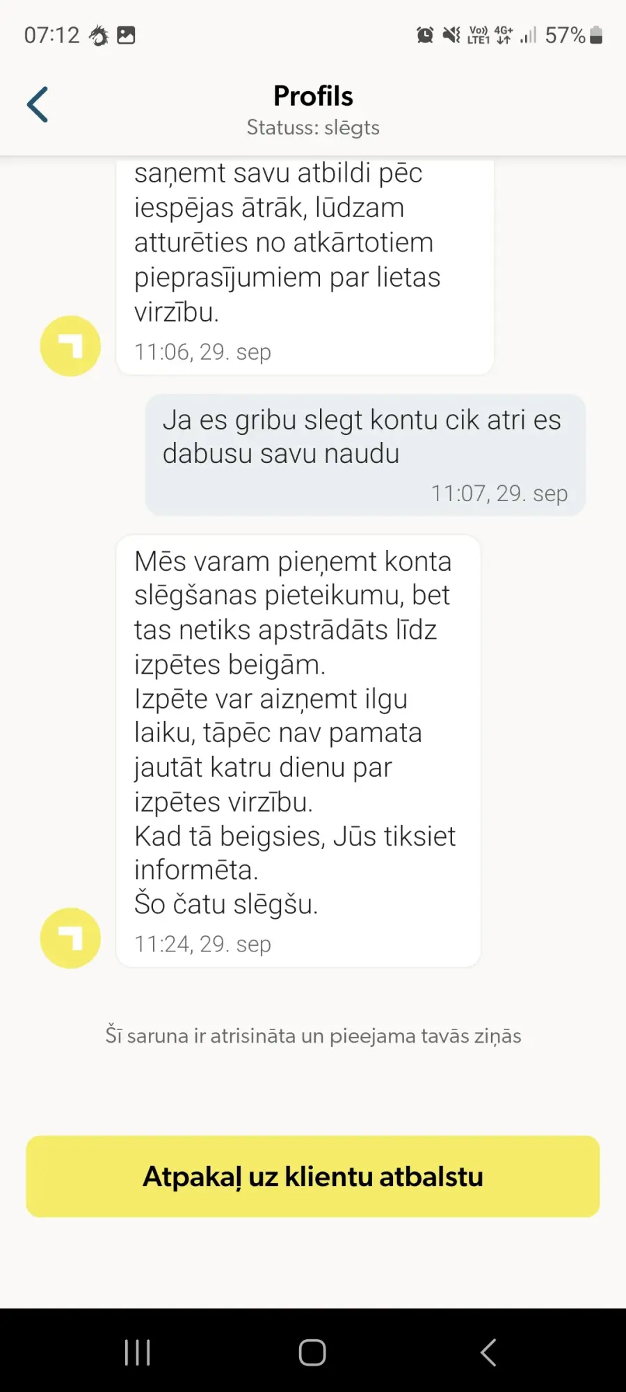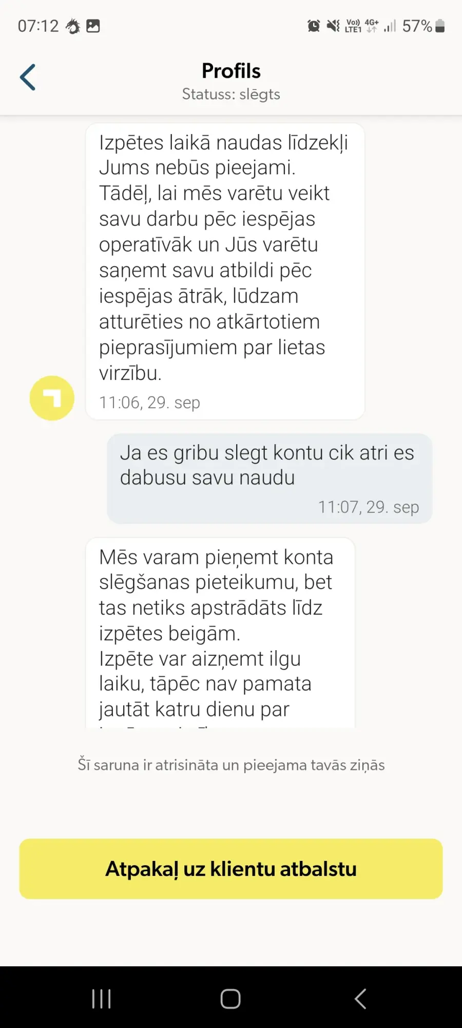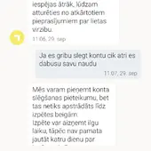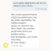 Aprīlī lūdzu slēgt kontu, oktobra sākuma nāk īsziņa, kā uz konta pozitīvs atlikums, jātiek vāļā no viņa un tad slēgs. Atjaunoju lietotni, tur viens cents pluss. Klauni.
