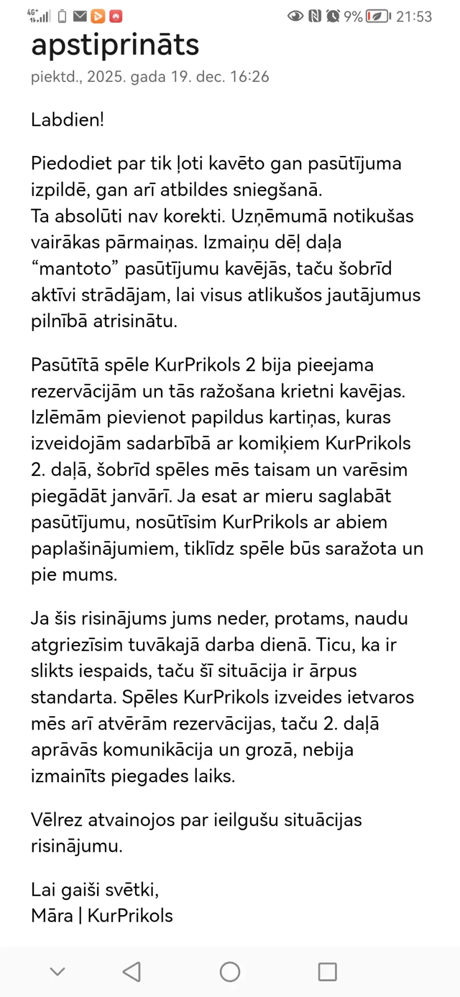 Pasūtīju spēles novembrī. Lapā rakstīts - piegāde 1-3 dienu laikā. Piegāde nav bijusi pat tagad vairāk kā pēc mēneša. Uz ēpastiem vairs neviens neatbild. Būtu zinājusi, nepirktu neko. Neiesaku nevienam iegādāties, ja vien nevēlaties būt apkrāpti!