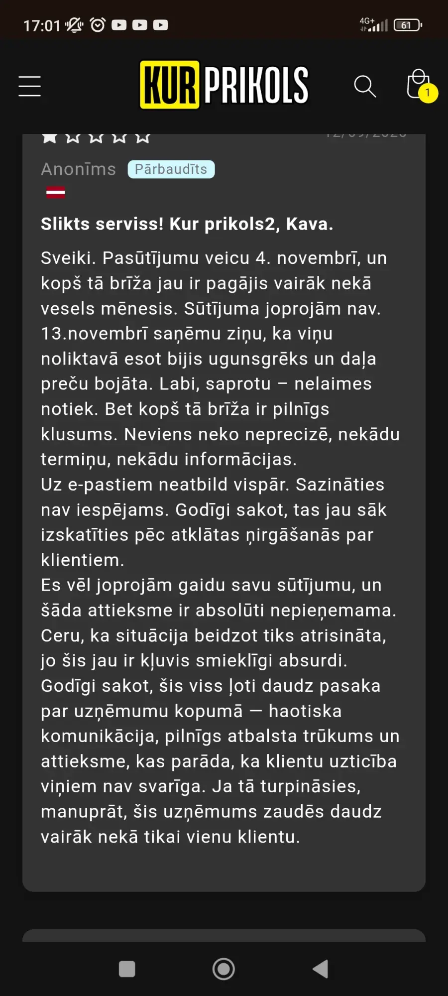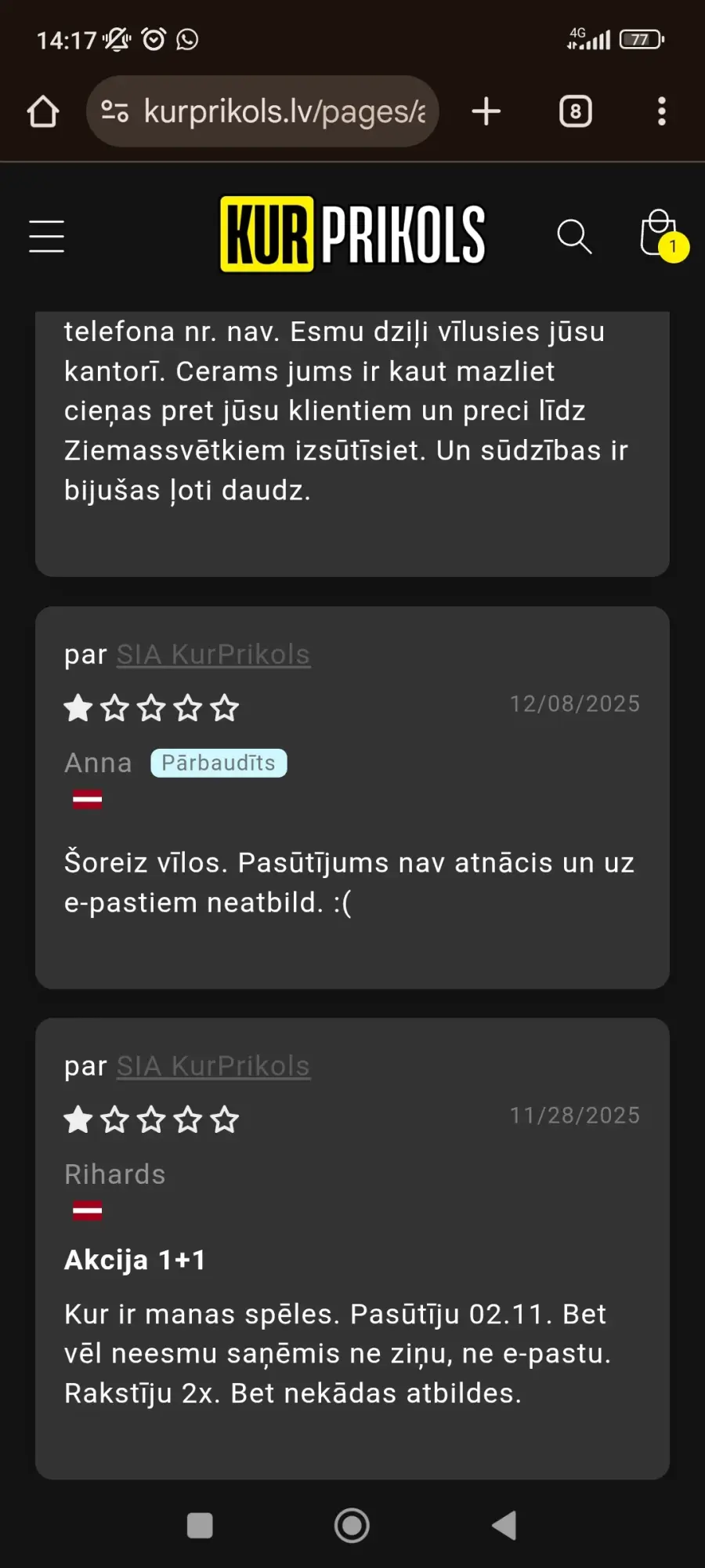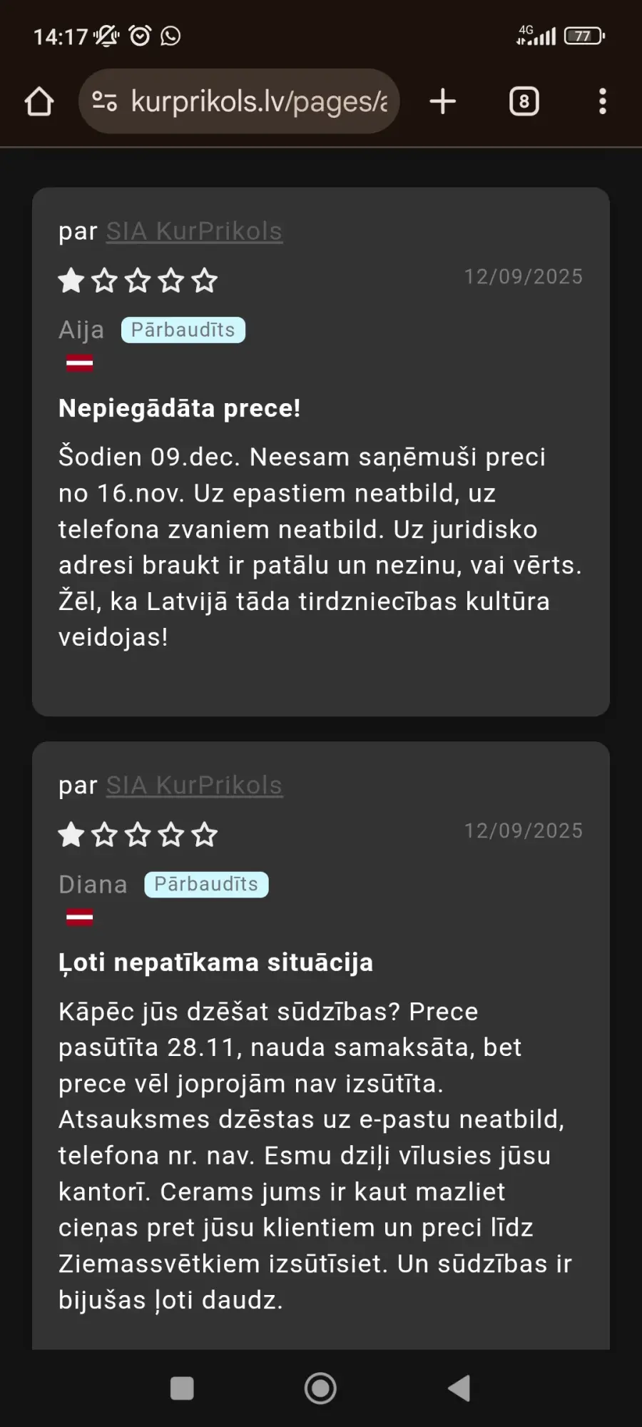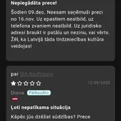 Papildus tam, esmu pamanīJusi, ka veikala mājaslapā iepriekš ir bijušas vairākas citu klientu sūdzības par līdzīgām situācijām — nepiegādātām precēm, taču šie komentāri tiek ātri dzēsti, kas raisa nopietnas bažas par uzņēmuma godprātību. Esmu uzrakstīJusi šodienas ekrānuzņēmums no saitā atsauksmēm, jo esmu pārliecināta, kā rīt to var nebūt.