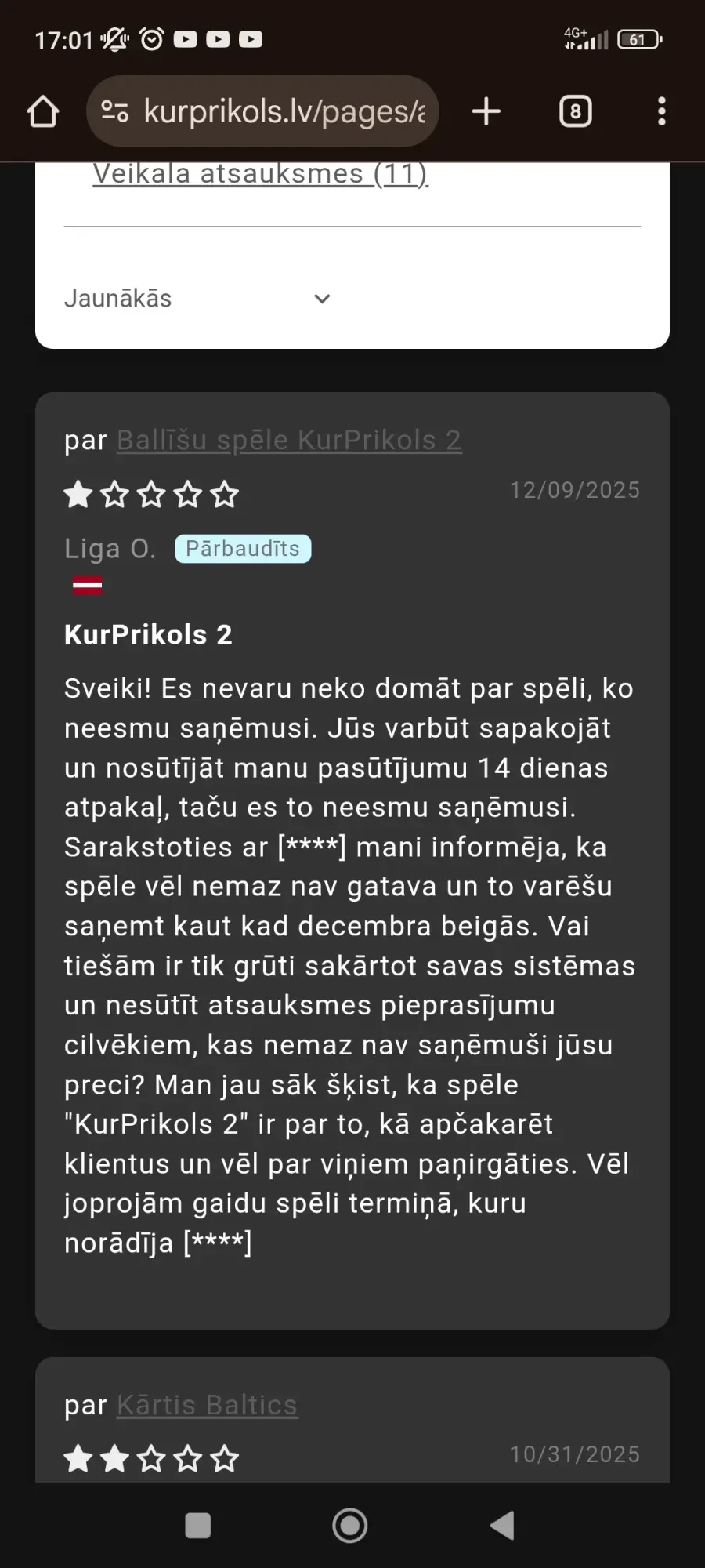 2024. Gada 28. Novembrī es veicu pasūtījumu interneta veikalā kurprikols.lv, iegādājoties galda spēli. Veikala mājaslapā bija norādīts, ka piegāde uz pakomātu notiek 1–3 darba dienās, taču šis solījums netika izpildīts.