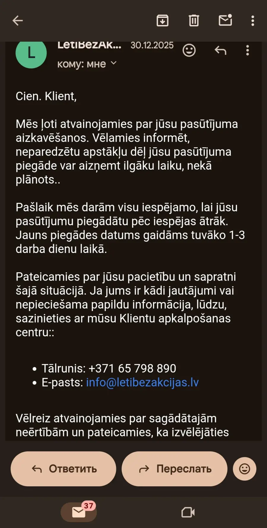 Krāpšana! Pirms Jaunā gada bija noformēts pasūtījums, saņēmu vēstuli par pasūtījuma aizkavēšanu, domajot par ka visi pērk pirms jaunā gada, bet arī pēc jaunā gada neviens neatbild, nav nekādu kontaktu - telefons, kurš norādīts neeksistē, uz epastu neatbild.