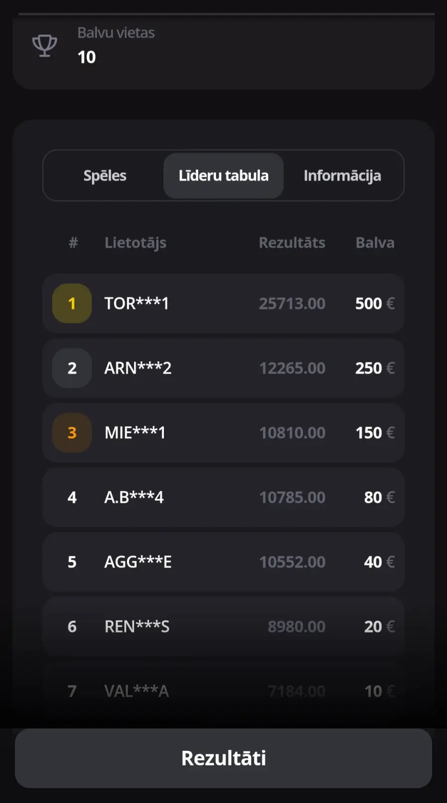Katru nedēļu notiek turnīrs, kur ir japievienojas un jaapgroza nauda un par to skaitās punkti. Tad nu lūk iegūstot 1 vietu turnīrā , jums atmet kā sunim 40€, 500€ vietā . Tabula katru dienu rāda kā punkti aug un jūs esat zirgā, bet kā pienāk izmaksas diena tā jūs tiekat apkrāpts un nedēļas garumā maldināts. Tad kad izmaksas dienā pajautā, kāpēc nav viss 500€ viņi pasaka ka tabulai ir ilustratīva nozīme, bet tas nekur netika minēts. Tā tomēr bija mana nauda ko liku uz spēles, lai dabūtu vairāk, izrādās, ka piepildīju kabatas tiem maitām . Neiesaku piedalīties turnīros un nevienā akcijā, jo tur visu laiku šmaucās. Tādēļ no tiem meļiem esmu atteikusies.