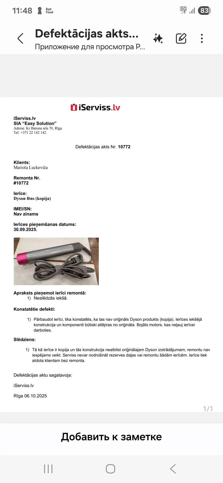 Купил в этом интернет магазине фен dyson. На тот момент он стоил 589евро. Покупая проверил по серийному номеру на официальном саййте dyson. Серийный номер прошел проверку. Прошло 3 года и фен сломался. Отнёс его в ремонт в iservice. Там констатировали, что вышел из строя эллектро мотор и то что это не оригинальный продукт, а реплика. В ремонте мне отказали, сославшись на то, что все внутренние компоненты отличаются от оригинала и их не возможно установить в этот прибор.. выдали мне письменное заключение о диагностике, где указали все то, что продукт не оригинальный. Почти неделю пытаюсь дозвониться до m79.lv, но никто не отвечает на звонки. На электронное письмо тоже ответа не последовало.