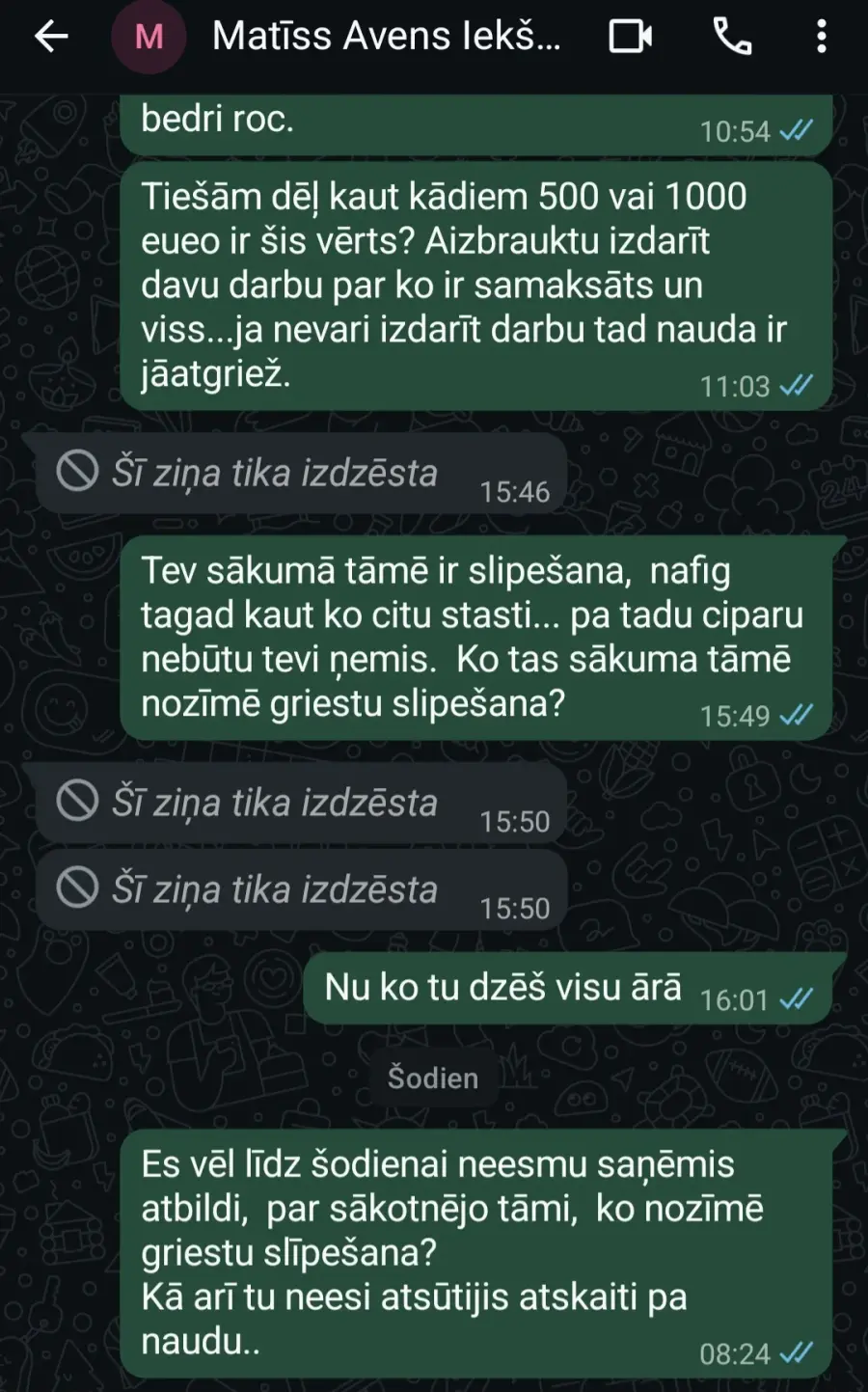 Ar naudu mēģina apkrāpt — pirmo reizi pieķēru, bet pēc laika tas atkārtojās. Tika pieprasīta samaksa par darbiem, kas nemaz nebija izdarīti, un pēc tam vēl mēģināja izlocīties ar nepārliecinošiem attaisnojumiem.