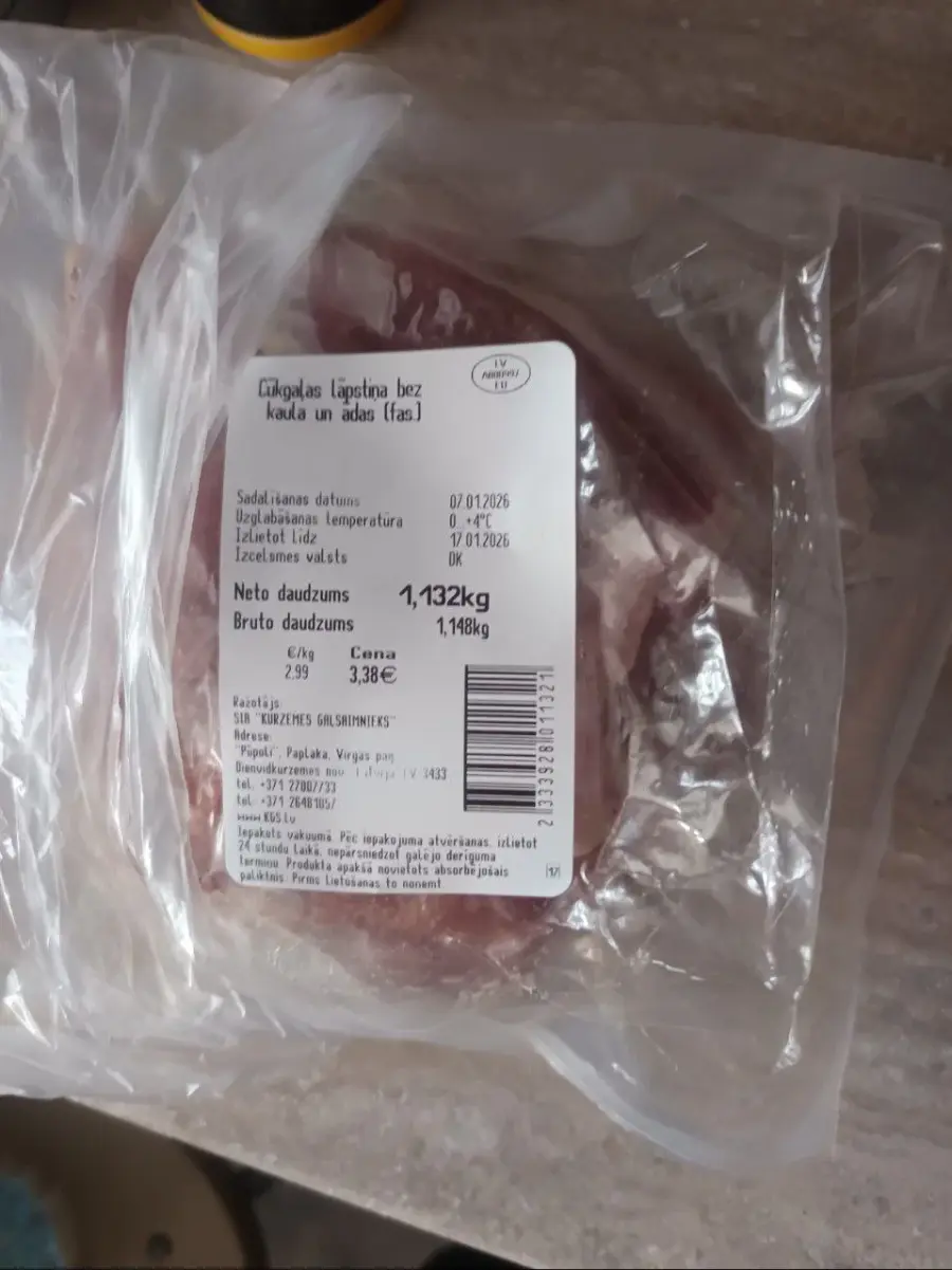 Veikalā, kas atrodas adresē Vienības gatve 113a 9.01.26, tika iegādāta gaļa "cūkgaļās lapstiņa bez kaula un ādas (fas.) " barkods 2333928011321, kas bija iepakota vakuumā.