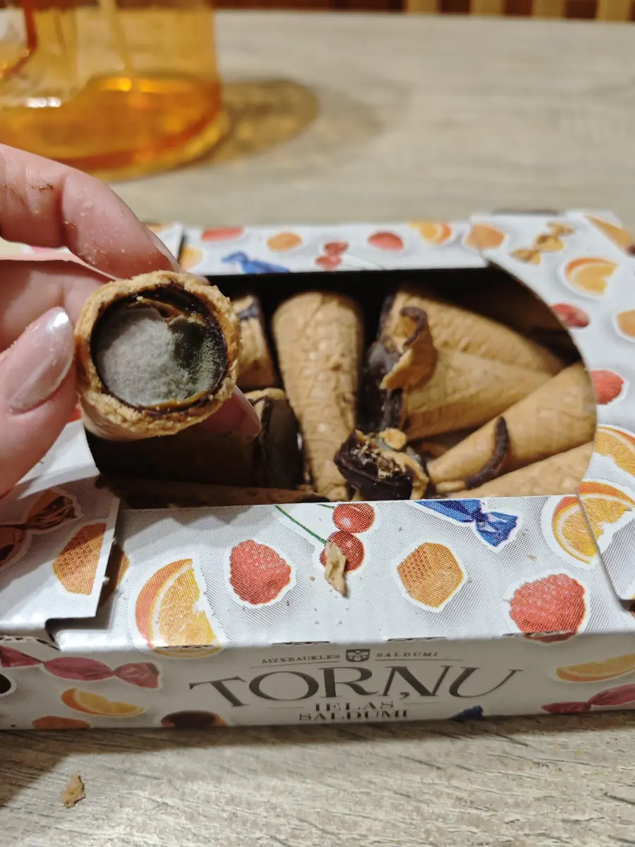 Šodien iegādājoties Aizkraukles saldumu ražotās vafeles ar vārītā piena pildījumu, tie izrādās ar pelējumu un liek aizdomāties, vai termiņš maz bija patiess.