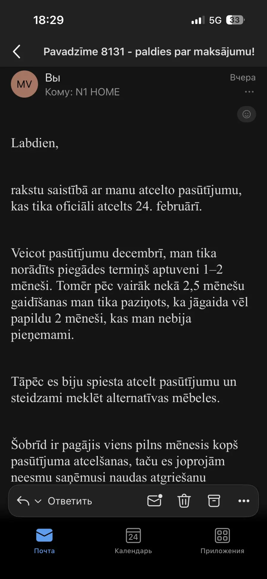 Šī situācija man radīJusi būtiskas neērtības — vairākus mēnešus dzīvoju bez nepieciešamajām mēbelēm (gulta, krēsli) , jo uzticējos veikala solījumiem. Tagad esmu spiesta meklēt alternatīvas, bet nevaru veikt jaunus pirkumus, jo ievērojama summa joprojām nav atgriezta.
