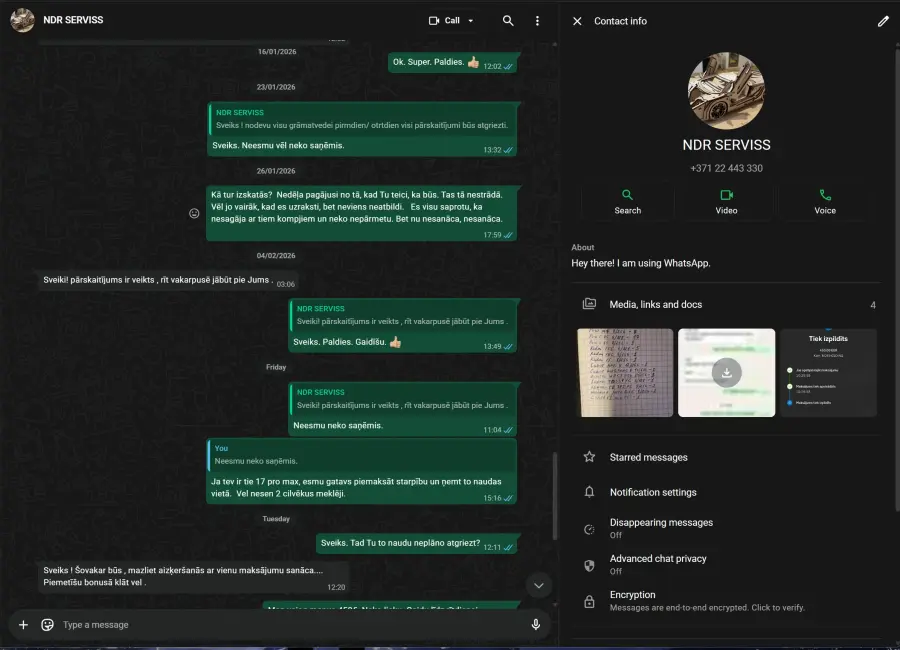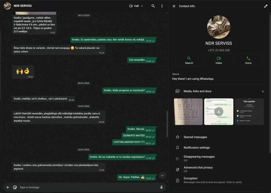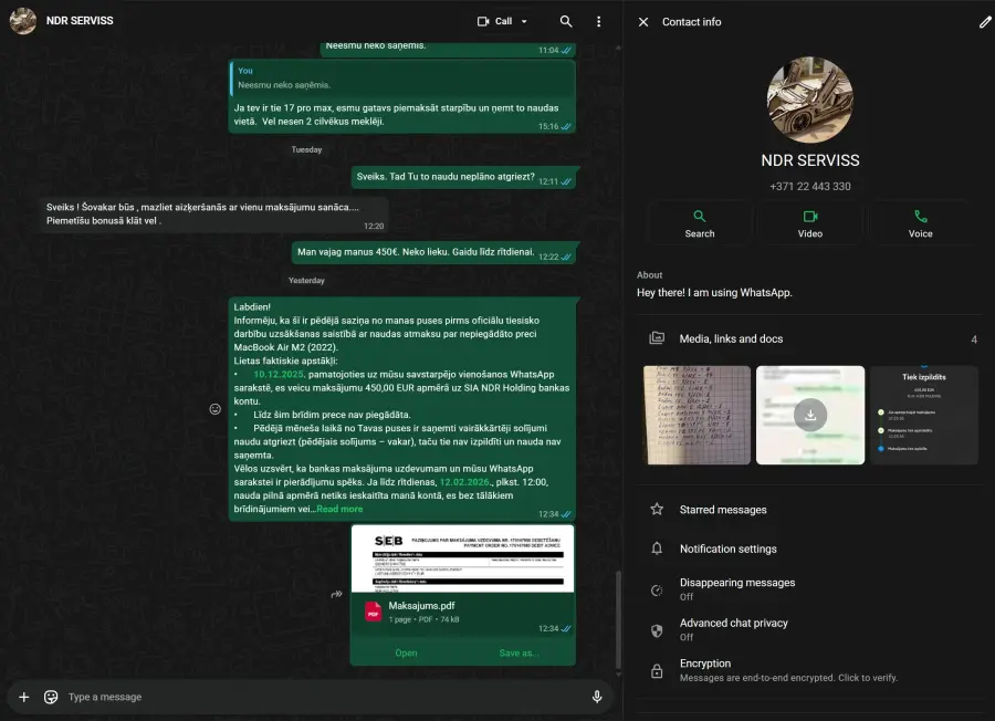 Uzķēros uz @ndrserviss TikTok reklāmu par izdevīgu MacBook pirkumu, taču pēc 450 EUR priekšapmaksas veikšanas uz SIA NDR Holding Wise kontu sākās problēmas un darījums tika atcelts. Kā iemesls tika minēts it kā pēkšņs AI un RAM cenu kāpums, kura dēļ krava Francijā esot kļuvusi dārgāka, taču solīto naudas atmaksu nevaru saņemt jau vairākus mēnešus. Pārdevējs regulāri baro ar tukšiem solījumiem, ka nauda būs "rīt" vai "šovakar", lai gan reklāma nāk no populāra @ndrserviss TikTok konta ar lielu sekotāju skaitu un fizisku veikalu Rīgā. Neuzķerieties uz šādiem solījumiem, jo sociālo tīklu atpazīstamība un maksājumi uz ārvalstu kontiem šajā gadījumā kalpo tikai kā uzticības aizsegs naudas izkrāpšanai, tāpēc par šo faktu ir iesniegts iesniegums Valsts policijā.