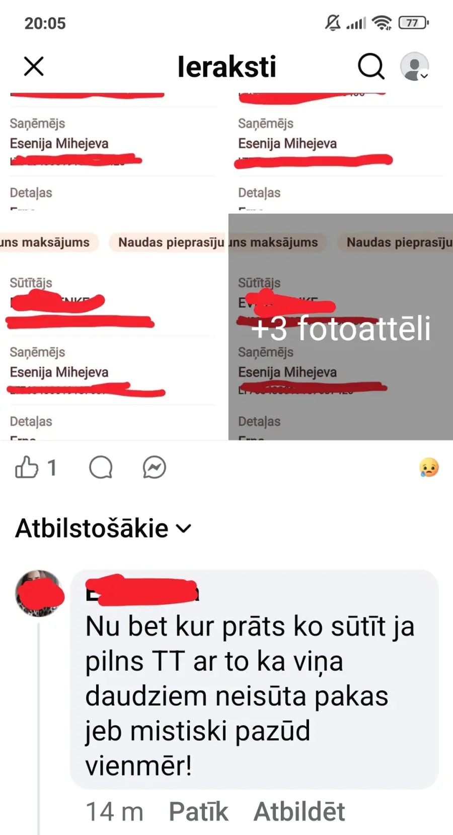 Iepirkos tiktok tiešraidēs pie viņas četros live, tātad veicu 4 maksājumus, pirmos 2 apvienoja kopā-tātad 1 sūtījumā, kopā vajadzētu saņemt 3 paciņas. Saņēmu tikai pēdējās 2, ir pierādījumi, un tikai 2 sūtījuma kodi.