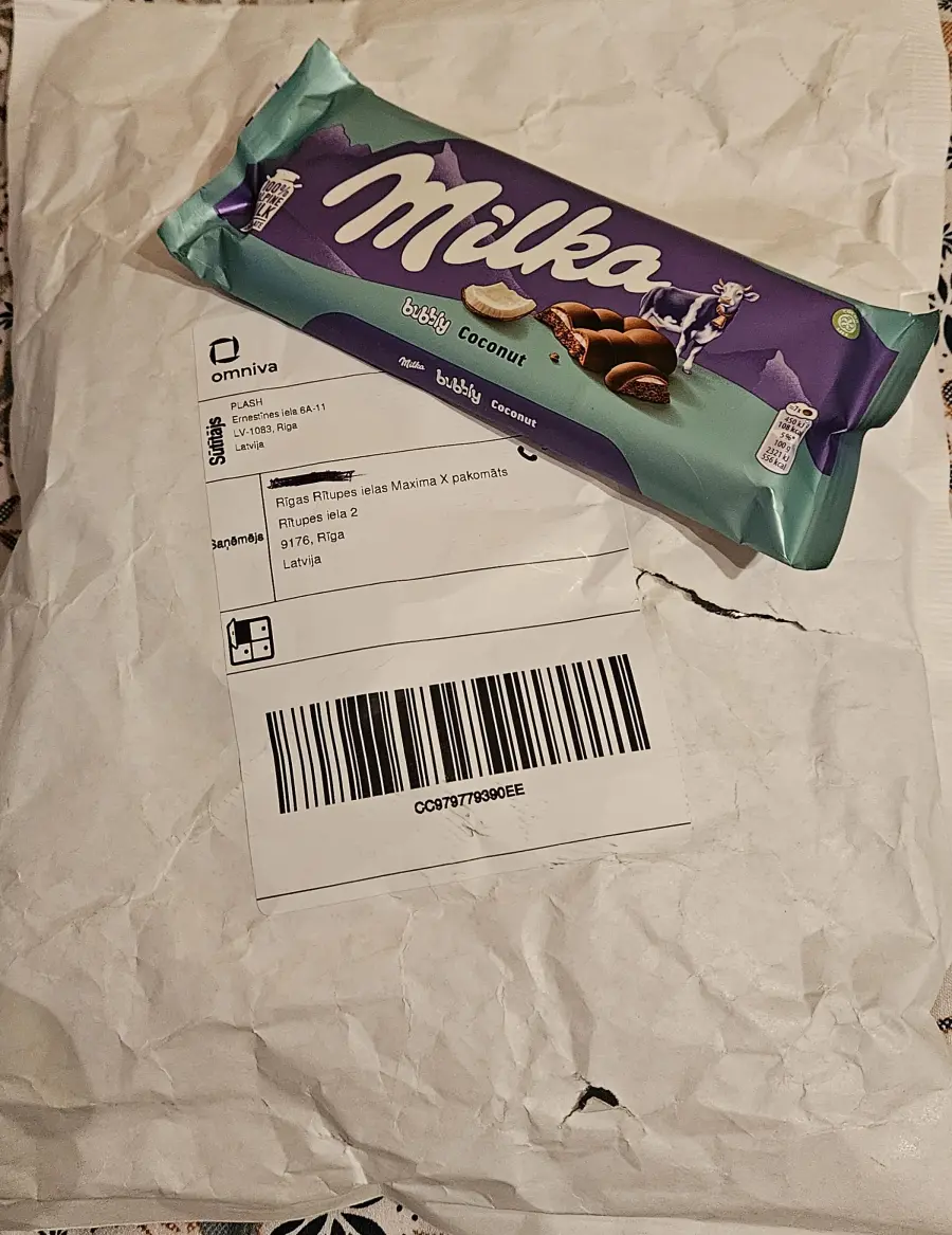 Gribu pateikt lielu paldies omniva darbiniekam! Saņemot paciņu, kura bija nedaudz bojāta, blakus atradu šokolādes tāfelīti, kā atvainošanos par bojājumu. Tas bija tik mīļi un patīkami. Smaids un laba vēlējumi.! 24.03.26 Rītupes iela Maxima. Ar cieņu Liene!
