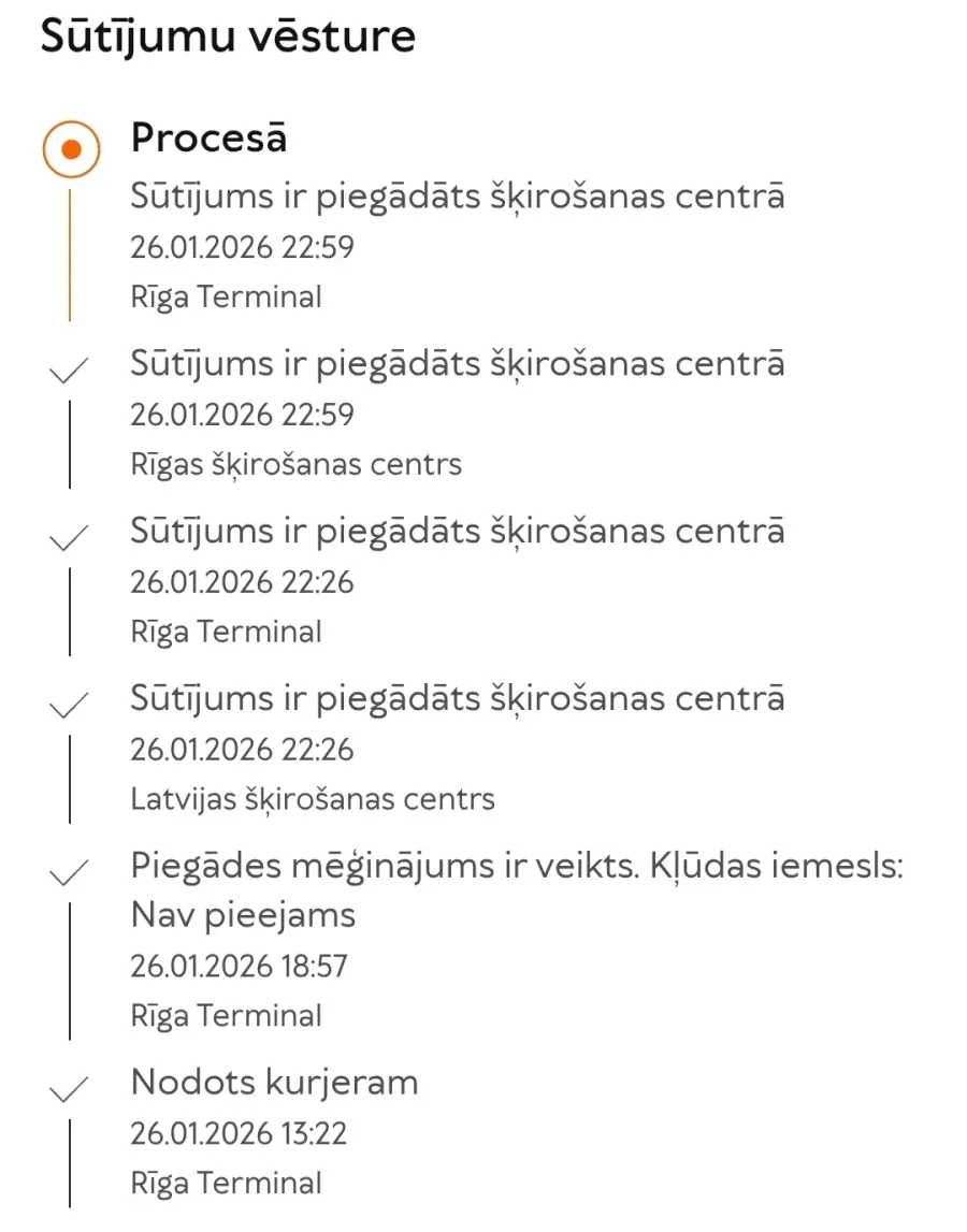 26.01.2026 saņemu paziņojumu, ka mans sūtījums ir nodots kurjeram piegādei un tas tiks piegādāts no 16:28 līdz 18:28. Sekoju savam sūtījumam Omniva vietnē. Kopš paziņojuma saņemšanas brīža statuss ir bijis nemainīgs - sūtījums ir ceļā. Noteiktajā laikā sūtījumu tā arī nesaņēmu, zvanu no kurjera arī nesagaidīju. Tad pēķšņi Omniva vietnē plkst. 18:57(!) mainās statuss - PROCESĀ. Izrādās, ka piegādes mēģinājums ir veikts. 😠 Kļūdas iemesls: nav pieejams.😠 Visu šo laiku biju mājās. Nez kāpēc kurjers aizveda manu paku atpakaļ uz šķirošanas centru, nevis ievietojis to kaut vai tuvākajā Omniva pakomātā. Pirmoreiz man radās tādas ķibeles ar kurjerpastu. Parasti mans nosūtītājs izmanto cita piegādes uzņēmuma pakalpojumus, ar kuro nebija nekādu problēmu. Iesaku neizmantot Omnivas pakalpojumus, plaša kurjerpasta izvēle to atļauj. Savukārt Omnivai iesaku email parakstu - Piegādājam prieku!- samainīt uz - prieku NEpiegādājam!