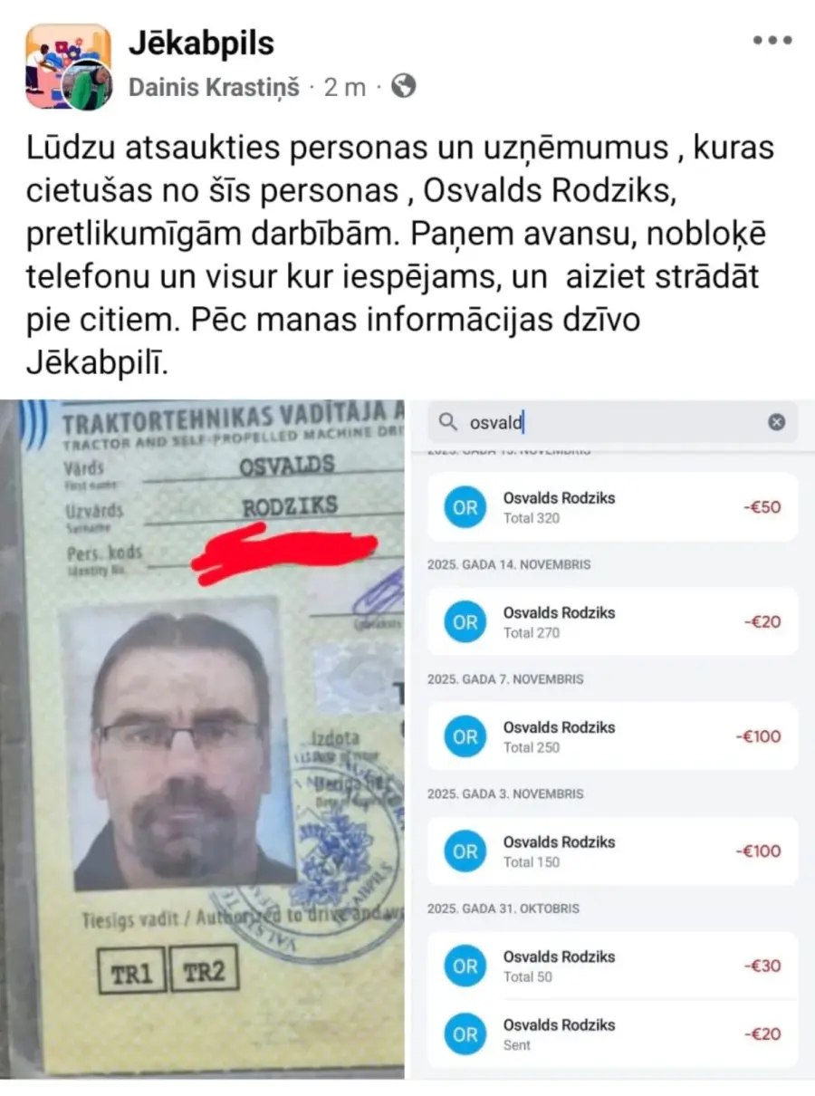 Lūdzu atsaukties personas un uzņemumus, kuras cietušas no šīs personas, pretlikumīgām darbībām. Izkrāpj avansu iežēlinot ar bērnu, pēc tam aiziet strādāt pie citiem un neatdod aizdoto naudu.