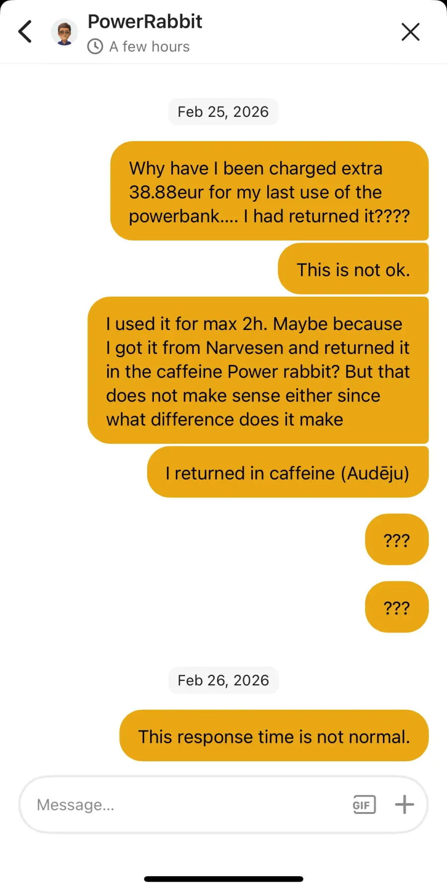 Dienu vēlāk no mana konta tika ieturēti 34,99 €, kas ir summa, kas tiek iekasēta gadījumā, ja powerbanka netiek atdota vispār. Es vēlējos noskaidrot šīs maksas iemeslu, taču jau 12 dienas neesmu saņēmis nekādu atbildi uz savu sūdzību.