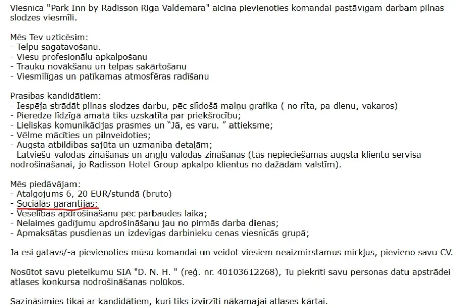 Viesnīca Radisson Blu Park Inn vakancē apgalvo, ka piedāvā sociālās garantijas, taču tas uzņēmums nekādas sociālās garantijas nedod.