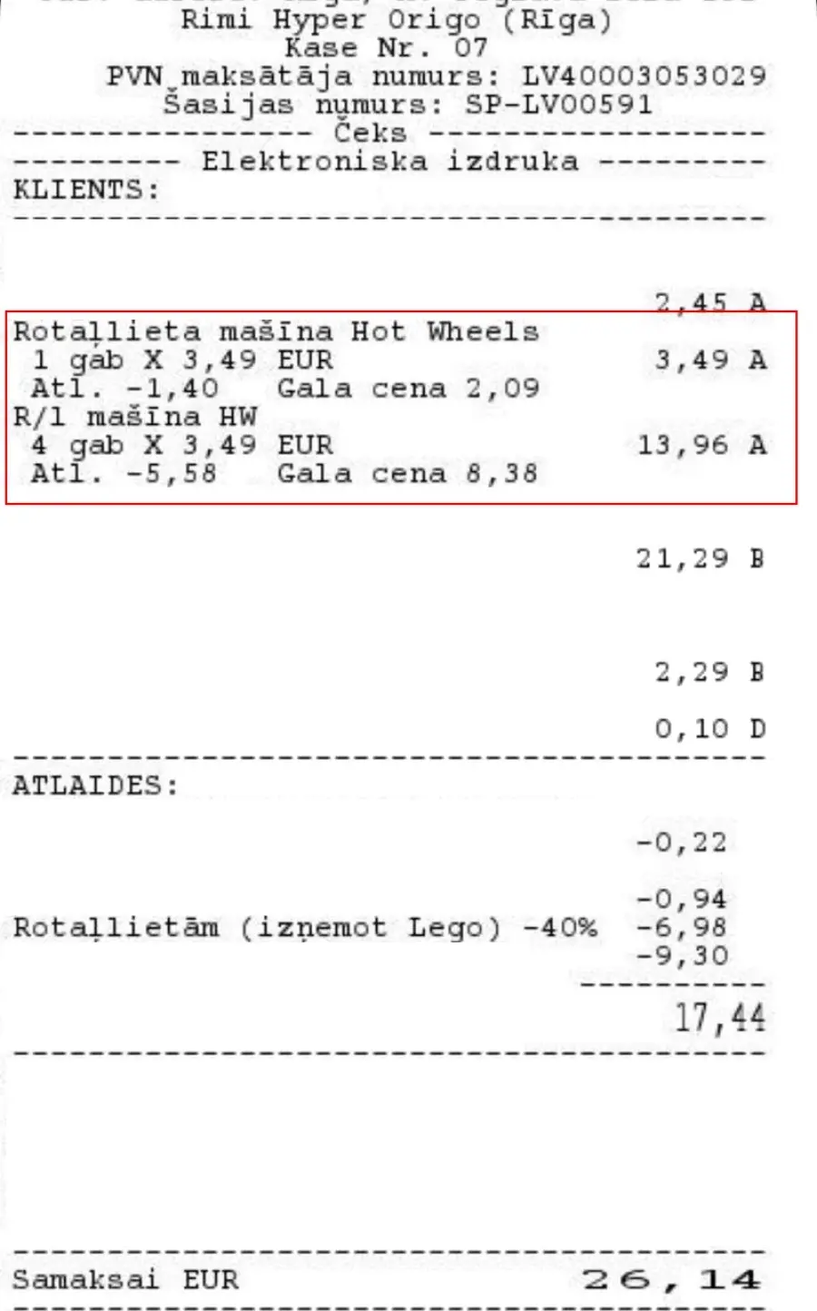 Nolēmu tieši šajā brīdī nestrīdēties, aiz manis smagi sāka nopūsties jaunietis ar aliņu, jo kavēju rindu, tāpēc samaksāju, taču paliku pie kases un apskatīju čeku. Tajā informācija ir tāda pati kā pie kases ekrānā. Prasīju paskaidrojumu, kuru nesaņēmu, prasīju kasieres vārdu, kuru viņa man neteica (vārda nozīmītes viņai nebija), un lūdzu, lai pasauc kādu citu palīdzēt, taču saņēmu norādi gaidīt. Gaidīšanas vietā aizgāju uz citu tuvāko, brīvo kasi, kur cita Rimi darbiniece apstiprināja, ka čekā kopā ir 5, nevis 4 gab. rotaļlietu. Šīs kasieres ieteikums bija doties atpakaļ un likt saukt vecāko kasieri.