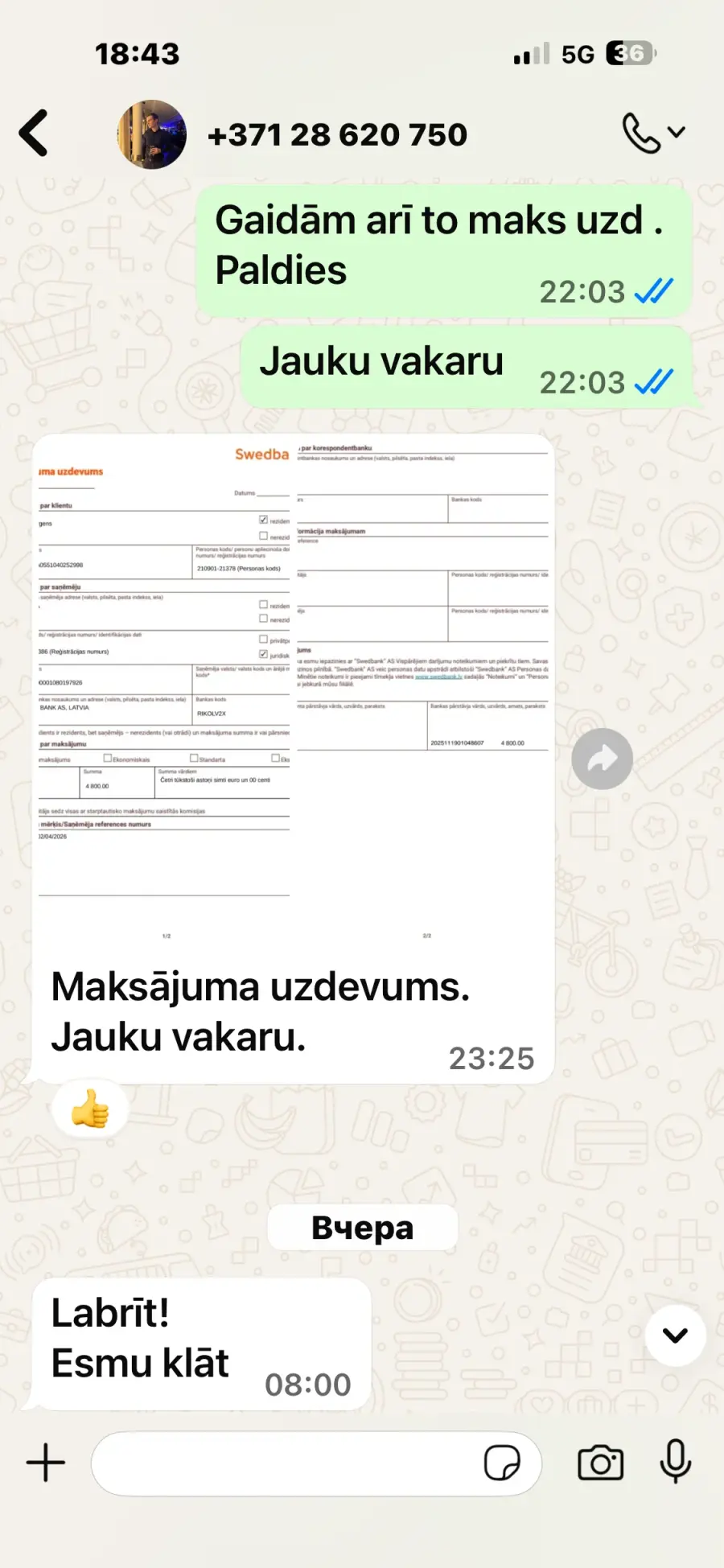 Šis cilvēks iznomāja auto atsūtot viltotu maksājuma uzdevumu. Sola maksājumu, saka ka ir kodu kalkulators, stāsta ka sazinājies ar banku un banka vainīga, ka nauda nav ienākusi. Kopumā neignorē, bet izdomā stāstus. Sazvanījos ar iepriekšējo darba devēju šim cilvēkam un stāsts ir tieši tāds pats - Uzmanieties no šī cilvēka. It īpaši par naudas jautājumiem.