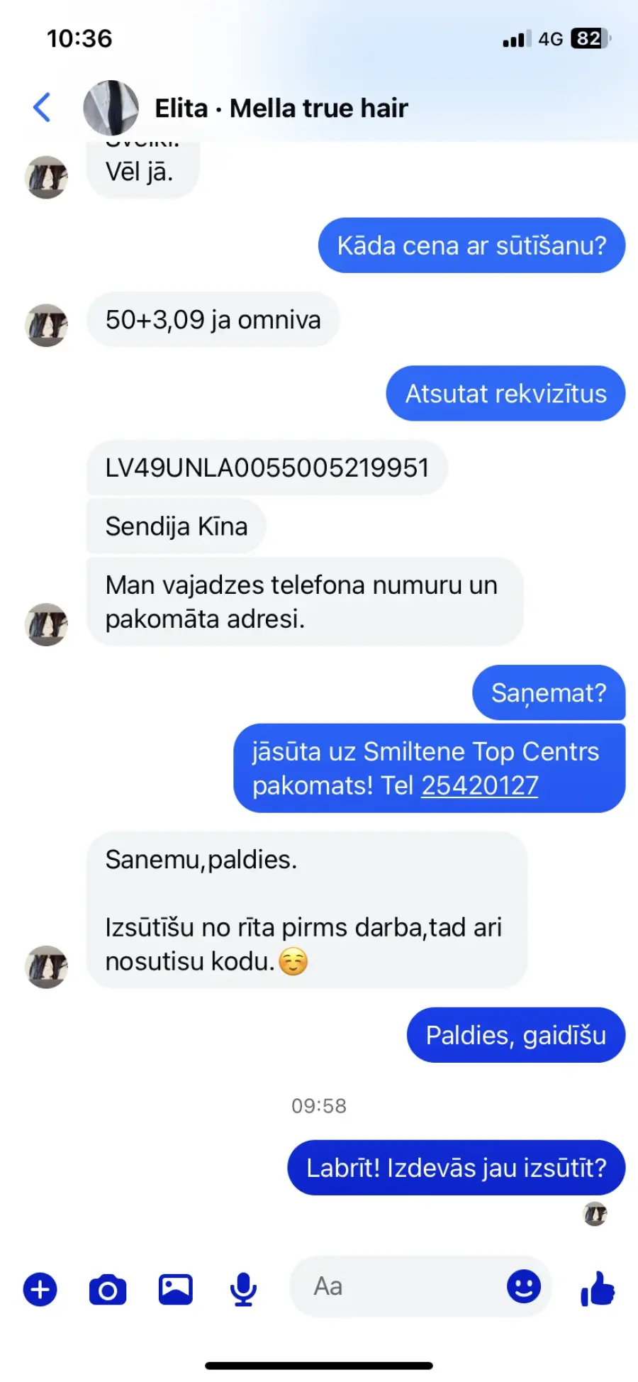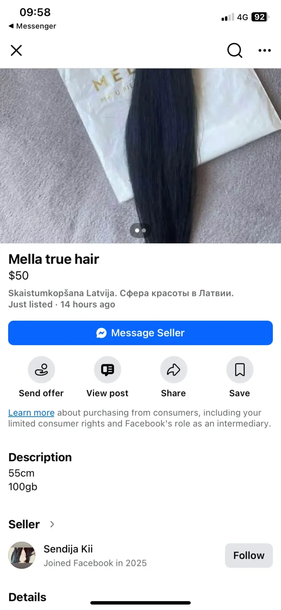 13.01 iegādājos Mella true hair pieaudzējamos matus no Sendija Kii (Sendija Ķīna) 50€+ 3.09€ Omnivas izmaksas! Šodien centos sazināties par izsūtīšanu, komunikācija pilnīgi nekāda! Uz telefona zvaniem neatbild, messenger neatbild, visur tiku nobloķēta! Sludinājums joprojām aktīvs, papētot bildes interneta sludinājums pārkopēts pavisam no cita tirgotāja! Ir visi Screenshoti.