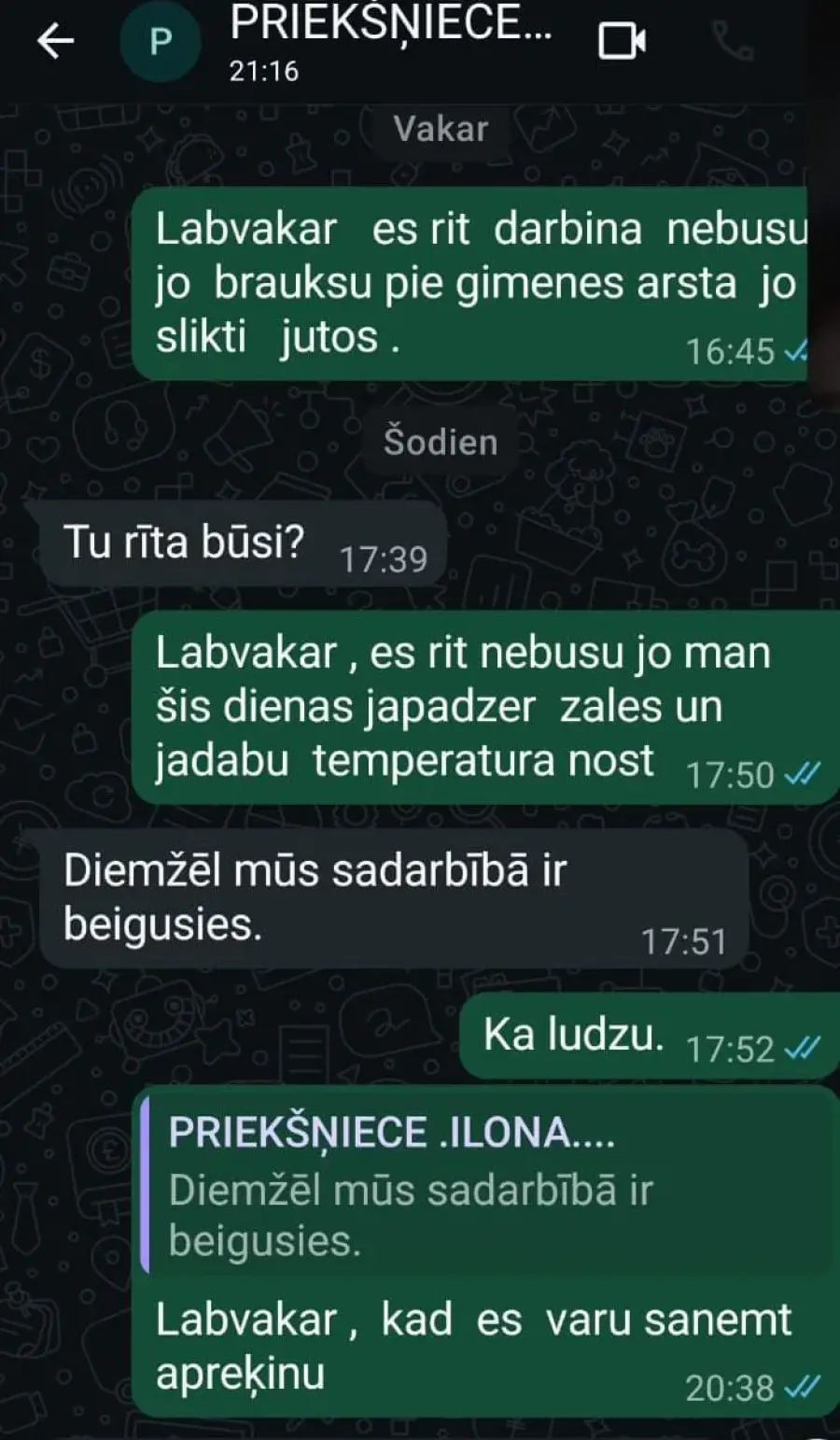 gada 19. janvārī veselības stāvokļa dēļ devas uz slimības lapu. 20. janvārī mammai tika jautāts, vai varēs turpināt strādāt, uz ko atbildēja, ka pagaidām nē, jo nepieciešams lietot ārsta nozīmētās zāles. Pēc šīs atbildes Ilona paziņoja, ka mūsu sadarbība ir beigusies.