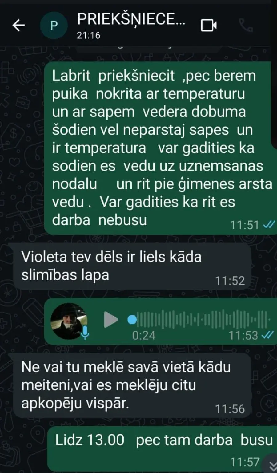 Pēc konkrētās sarakstes rodas priekštats, ka cilvēks meklē iemeslus nenākt uz darbu. Vienam slikti, tad otram slikti. Visādi var gadīties. Cik lielajam dēlam gadu? Bija uzņemšanas nodaļā? Kāds bija pie ģimenes ārsta? Slimības lapa ir? Ja nē, tad tas izskatās maksimāli slikti. Jauns darbinieks un katru dienu saka, ka nebūs darbā.