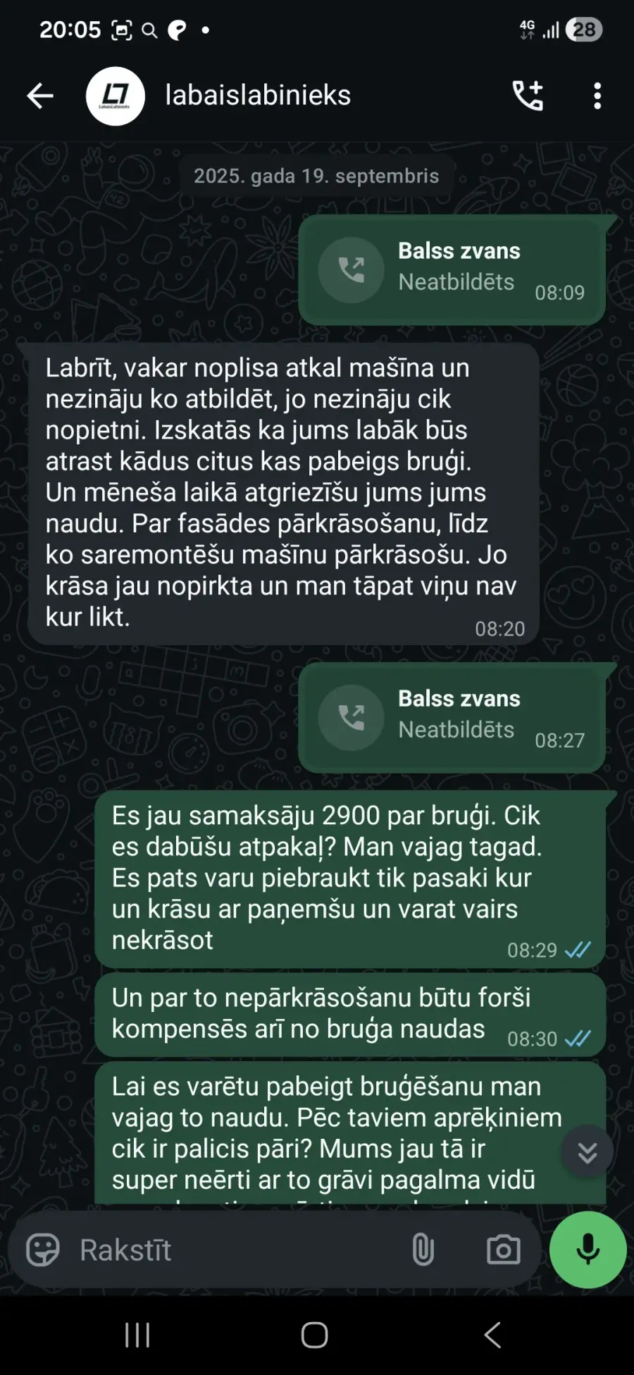 Diemžēl es vienojos arī par bruģa likšanu, samaksāju par materiāliem 2000 eur + avanss 900 eur (iedevu tikai tāpēc, ka nākamajā dienā teica, ka it kā esot aizmirsis maku). Pagalmā izraka tranšeju un ar to darbi arī apstājās. Tad slimoja ilgāk kā mums bērni dārziņā, tad mašīna plīsa. Faktiski darbs + materiāls tika paveikts par 900 eur un 2000 eur līdz šim vēl nav atdoti (2 mēn pagājuši). Pats atteicās turpināt darbu un apsolijās atgriest naudu 1 mēn laikā. Man ir aizdomas, ka materiāla nauda ir aizgājusi kaut kur citur un vienkārši nav ko atdot. Neuzticat šai firmai lielākus darbus un maksājat TIKAI par padarīto. Te arī linki ar citām cilvēku sūdzībām par firmu/cilvēku:
