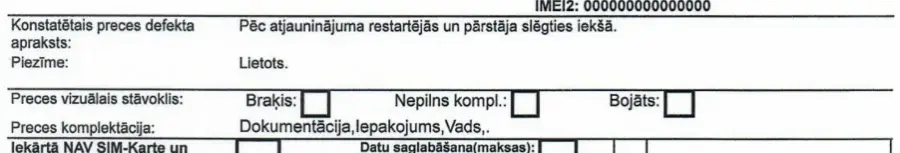 Pēc ieģadātās planšetes pirmās ieslēgšanas tā darbojās tikai apmēram 4 stundas, pēc tam pieprasīja atjauninājumu un restartu, taču pēc restarta vairs neieslēdzās. 17.10.2025. nodevu planšeti, RD Electronics veikalā Latgales ielā 240, lai to nosūta remontā un pieņemšanas laikā netika konstatēti nekādi ārējie bojājumi, kas apliecināts arī pieņemšanas aktā (pielikumā), kur nav norādīts neviens defekts. Pēc preces nodošanas veikala darbinieks mani informēja, ka pirms ierīces nosūtīšanas uz servisu tika uzņemtas fotogrāfijas, kas apliecina ierīces vizuālo stāvokli. 20.10.2025. ierīce jau atradās servisā.