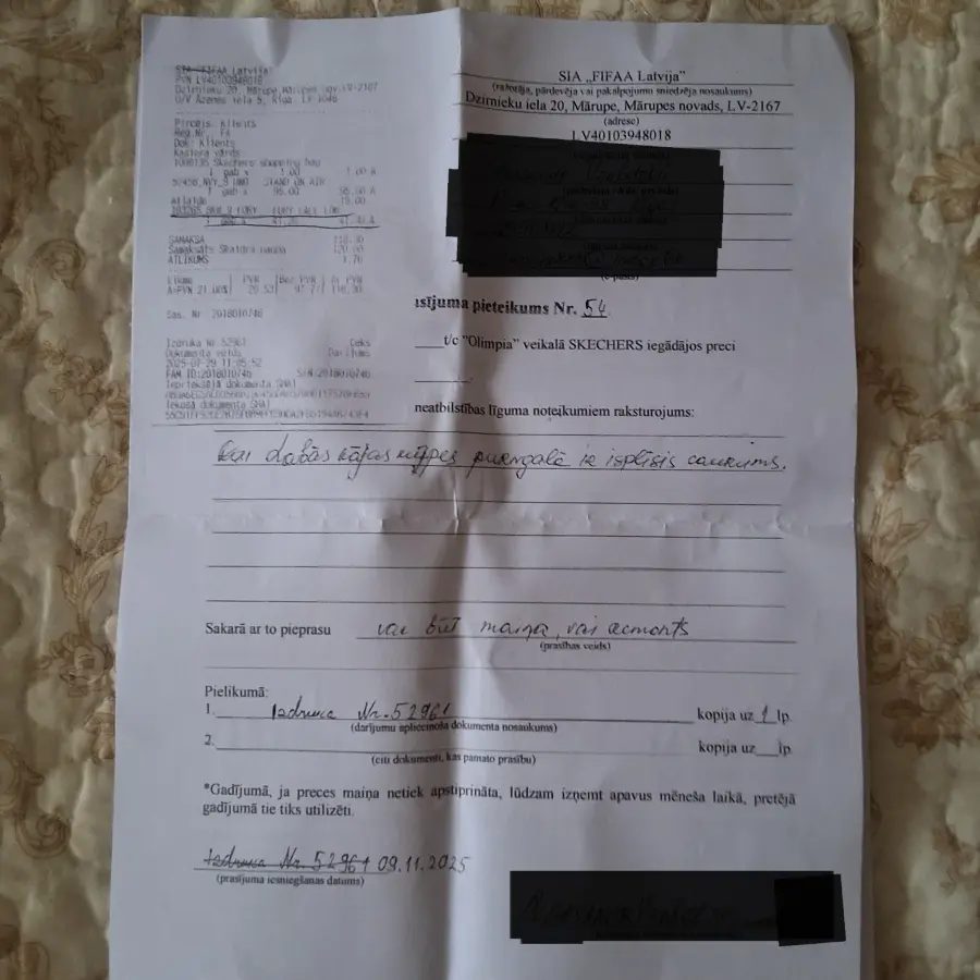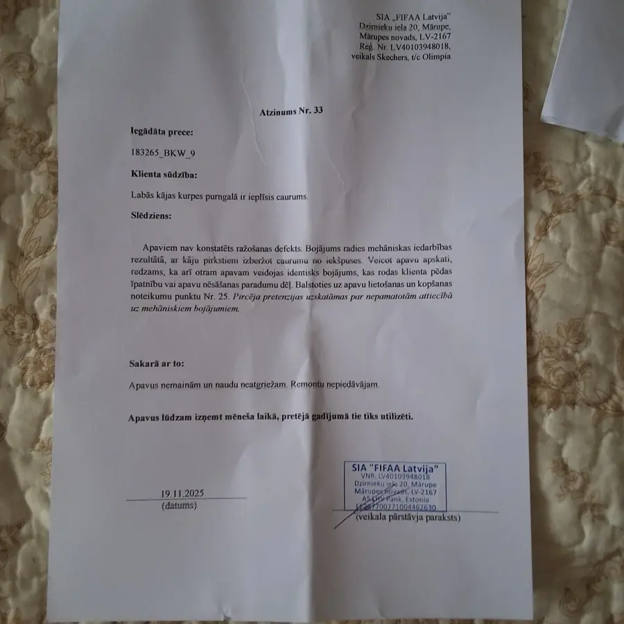 Муж купил кроссовки в магазине Skechers t/c Olimpija в городе Рига в июле 2025 года. В конце октября 2025 года кроссовки порвались в районе большого пальца. 3 месяца служила обувь, и она протёрлась. Это из каких материалов шьётся данная обувь? Если продолжительность "бумажной" обуви 3 месяца, то и цена должна быть маленькая, а не та, по которой продают обувь Skechers. Обувь не приняли ни на ремонт, ни на замену, ни возврат средст потраченных на неё. Отписались бумажкой в которой доказали, что обувь не предназначена для ношения больше 3 месяцев. Написали, что ничего делать не будут, т. к. дырка образовалась механическим воздействием. Вывод: Обувь Skechers предназначена для ношения не больше 3-х месяцев, без пальцев, да и вообще можно просто на полочку поставить и не носить, тогда может быть она прослужит дольше. Сильное разочарование в фирме Skechers, в обслуживании клиентов, нет гарантии.